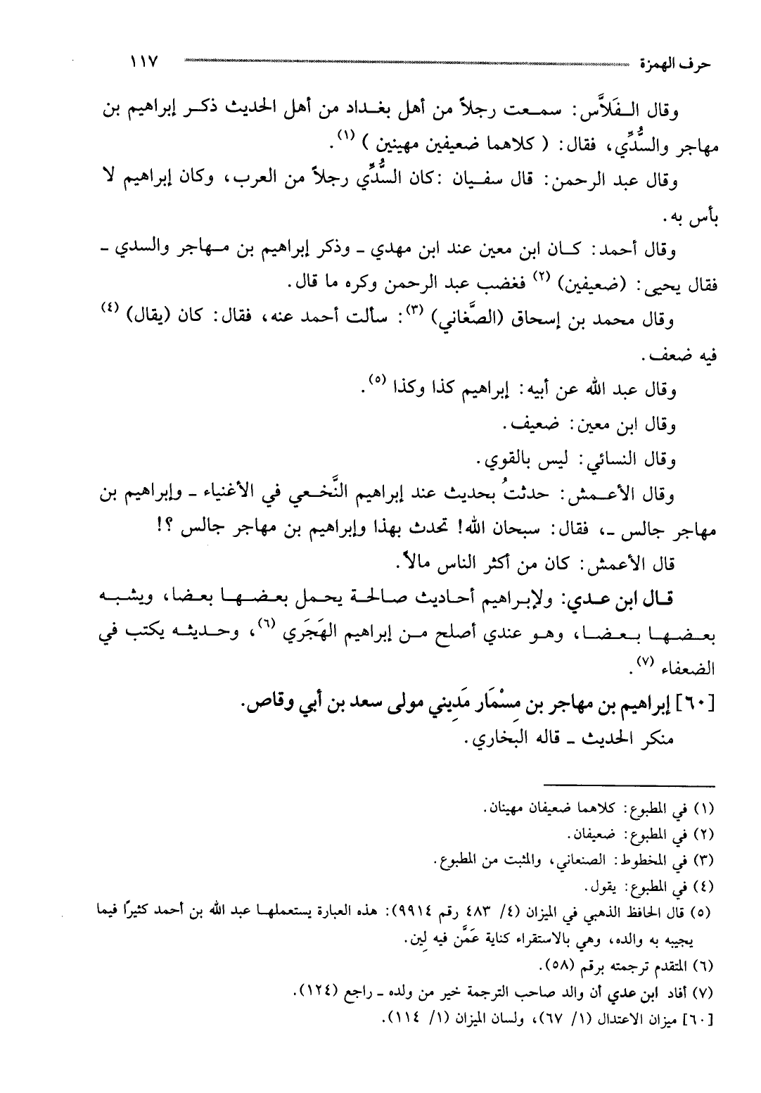 وَقَالَ الفلاس: سَمِعت رجلا من أهل بَغْدَاد من أهل الحَدِيث ذكر إِبْرَاهِيم بن مهَاجر وَالسُّديّ، فَقَالَ: (كِلَاهُمَا ضعيفين مهينين) .