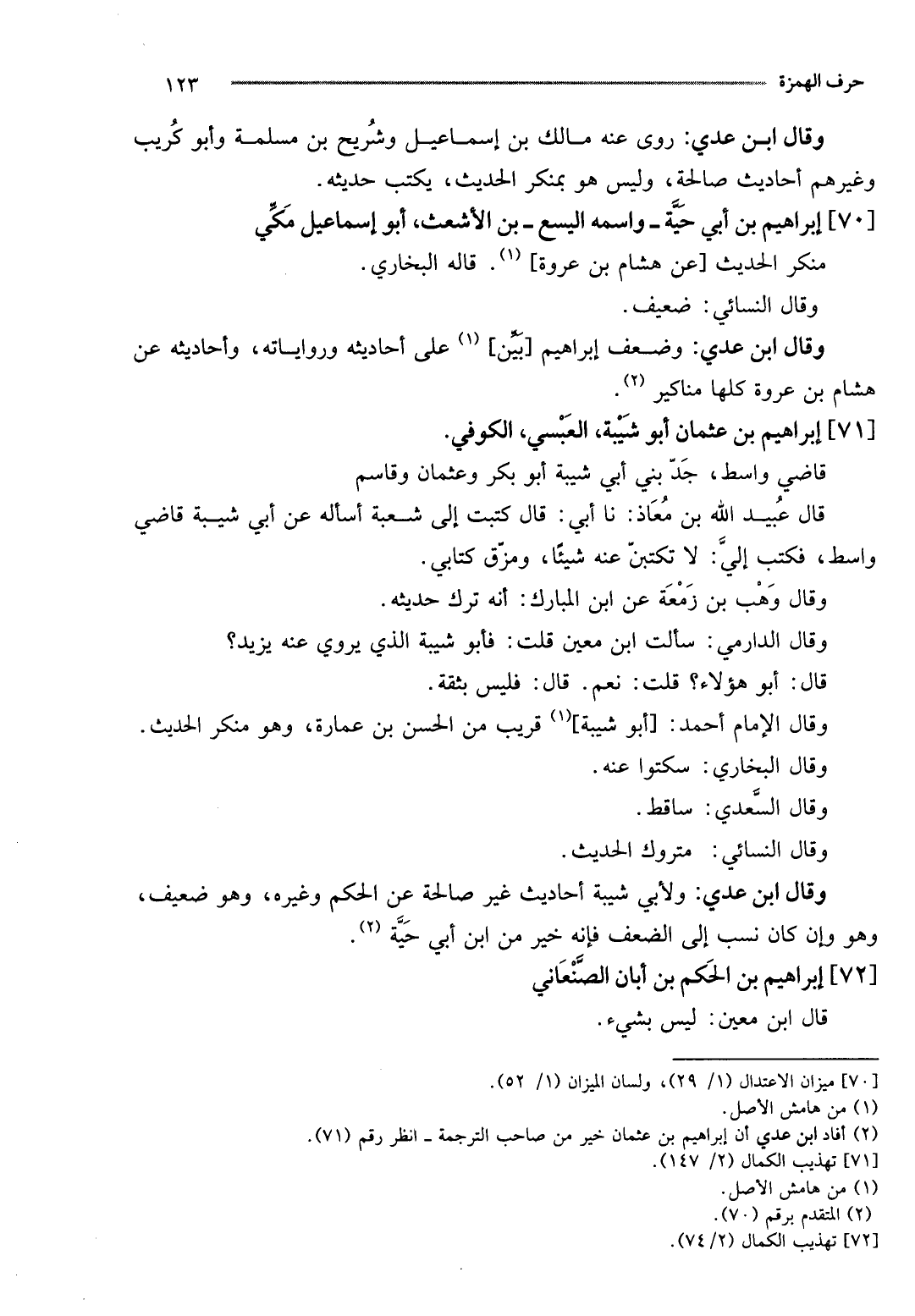 وَقَالَ ابْن عدي: وَضعف إِبْرَاهِيم [بَين] على أَحَادِيثه ورواياته، وَأَحَادِيثه عَن هِشَام بن عُرْوَة كلهَا مَنَاكِير.