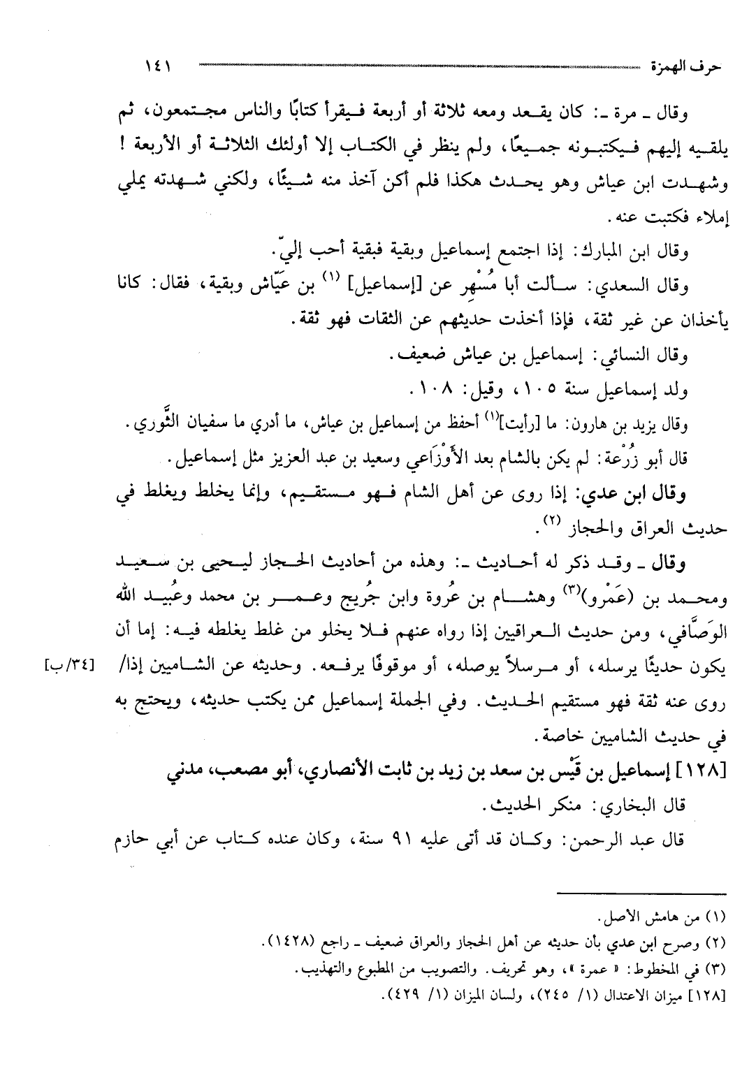 وَقَالَ - وَقد ذكر لَهُ أَحَادِيث -: وَهَذِه من أَحَادِيث الْحجاز ليحيى بن سعيد وَمُحَمّد بن (عَمْرو) وَهِشَام بن عُرْوَة وَابْن جريج وَعمر بن مُحَمَّد وَعبيد الله الْوَصَّافِي، وَمن حَدِيث الْعِرَاقِيّين إِذا رَوَاهُ عَنْهُم فَلَا يَخْلُو من غلط يغلطه فِيهِ: إِمَّا أَن يكون حَدِيثا يُرْسِلهُ، أَو مُرْسلا يوصله، أَو مَوْقُوفا يرفعهُ. وَحَدِيثه عَن الشاميين إِذا / روى عَنهُ ثِقَة فَهُوَ مُسْتَقِيم الحَدِيث. وَفِي الْجُمْلَة إِسْمَاعِيل مِمَّن يكْتب حَدِيثه، ويحتج بِهِ فِي حَدِيث الشاميين خَاصَّة.