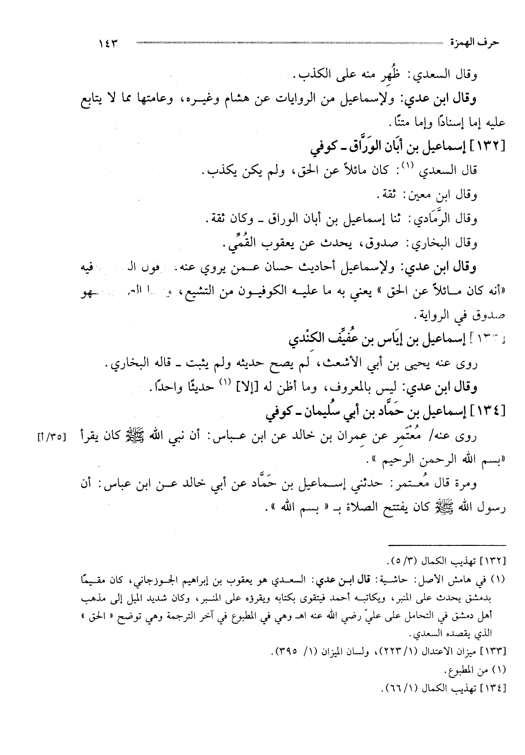 وَقَالَ ابْن عدي: ولإسماعيل أَحَادِيث حسان عَمَّن يروي عَنهُ، وَقَول السَّعْدِيّ فِيهِ " أَنه كَانَ مائلا عَن الْحق " يَعْنِي بِهِ مَا عَلَيْهِ الْكُوفِيُّونَ من التَّشَيُّع، وَأما الصدْق فَهُوَ صَدُوق فِي الرِّوَايَة.