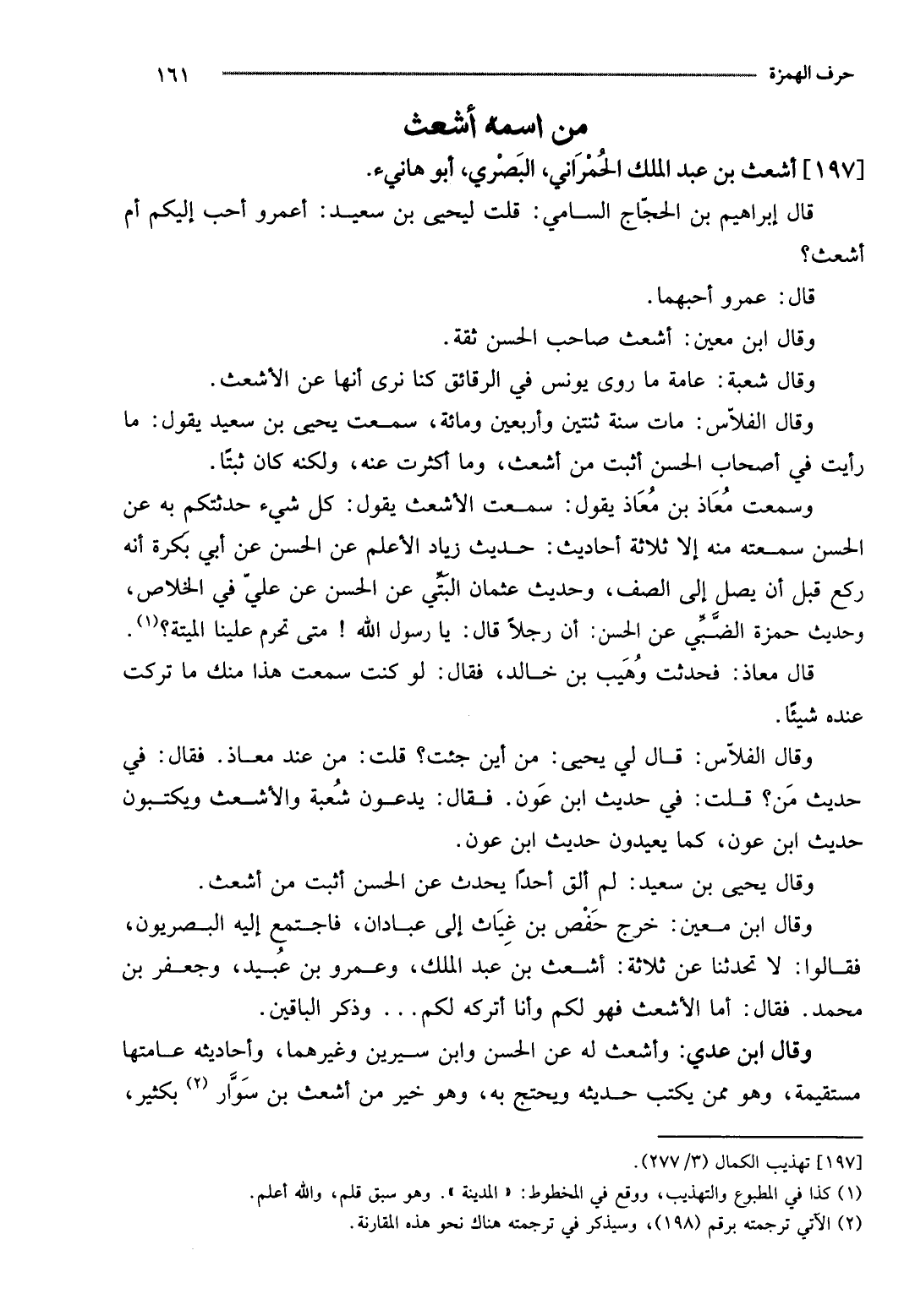 قَالَ إِبْرَاهِيم بن الْحجَّاج السَّامِي: قلت ليحيى بن سعيد: أعمرو أحب إِلَيْكُم أم أَشْعَث؟