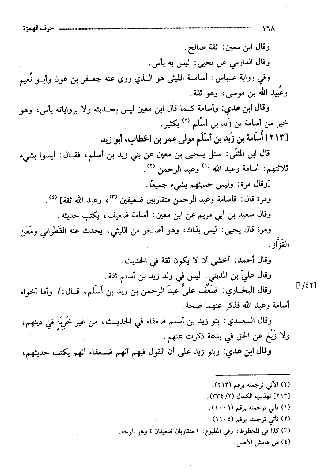 وَمرَّة قَالَ: فأسامة وَعبد الرَّحْمَن متقاربين ضعيفين، وَعبد الله ثِقَة] .