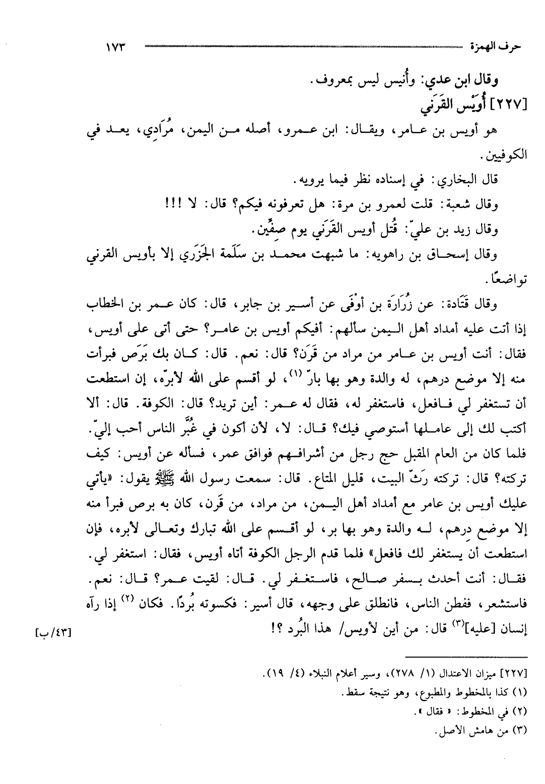 وَقَالَ قَتَادَة: عَن زُرَارَة بن أوفى عَن أَسِير بن جَابر، قَالَ: كَانَ عمر بن الْخطاب إِذا أَتَت عَلَيْهِ أَمْدَاد أهل الْيمن سَأَلَهُمْ: أفيكم أويس بن عَامر؟ حَتَّى أَتَى على أويس، فَقَالَ: أَنْت أويس بن عَامر من مُرَاد من قرن؟ قَالَ: نعم. قَالَ: كَانَ بك برص فبرأت مِنْهُ إِلَّا مَوضِع دِرْهَم، لَهُ وَالِدَة وَهُوَ بهَا بار، لَو أقسم على الله لَأَبَره، إِن اسْتَطَعْت أَن تستغفر لي فافعل، فَاسْتَغْفر لَهُ، فَقَالَ لَهُ عمر: أَيْن تُرِيدُ؟ قَالَ: الْكُوفَة. قَالَ: أَلا أكتب لَك إِلَى عاملها أستوصي فِيك؟ قَالَ: لَا، لِأَن أكون فِي غبر النَّاس أحب إِلَيّ. فَلَمَّا كَانَ من الْعَام الْمقبل حج رجل من أَشْرَافهم فَوَافَقَ عمر، فَسَأَلَهُ عَن أويس: كَيفَ تركته؟ قَالَ: تركته رث الْبَيْت، قَلِيل الْمَتَاع. قَالَ: سَمِعت رَسُول الله - صَلَّى اللَّهُ عَلَيْهِ وَسَلَّم َ - يَقُول: " يَأْتِي عَلَيْك أويس بن عَامر مَعَ أَمْدَاد أهل الْيمن، من مُرَاد، من قرن، كَانَ بِهِ برص فبرأ مِنْهُ إِلَّا مَوضِع دِرْهَم، لَهُ وَالِدَة وَهُوَ بهَا بر، لَو أقسم على الله تبَارك وَتَعَالَى لَأَبَره، فَإِن اسْتَطَعْت أَن يسْتَغْفر لَك فافعل " فَلَمَّا قدم الرجل الْكُوفَة أَتَاهُ أويس، فَقَالَ: اسْتغْفر لي. فَقَالَ: أَنْت أحدث بسفر صَالح، فَاسْتَغْفر لي. قَالَ: لقِيت عمر؟ قَالَ: نعم. فاستشعر، فَفطن النَّاس، فَانْطَلق على وَجهه، قَالَ: أَسِير: فكسوته بردا. فَكَانَ إِذا رَآهُ إِنْسَان [عَلَيْهِ] قَالَ: من أَيْن لأويس / هَذَا الْبرد؟}