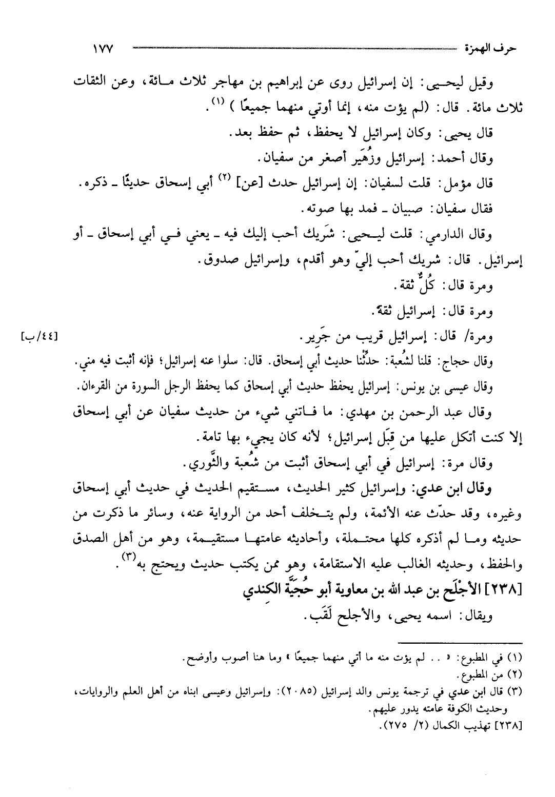 وَقَالَ عبد الرَّحْمَن بن مهْدي: مَا فَاتَنِي شَيْء من حَدِيث سُفْيَان عَن أبي إِسْحَاق إِلَّا كنت أتكل عَلَيْهَا من قبل إِسْرَائِيل؛ لِأَنَّهُ كَانَ يَجِيء بهَا تَامَّة.