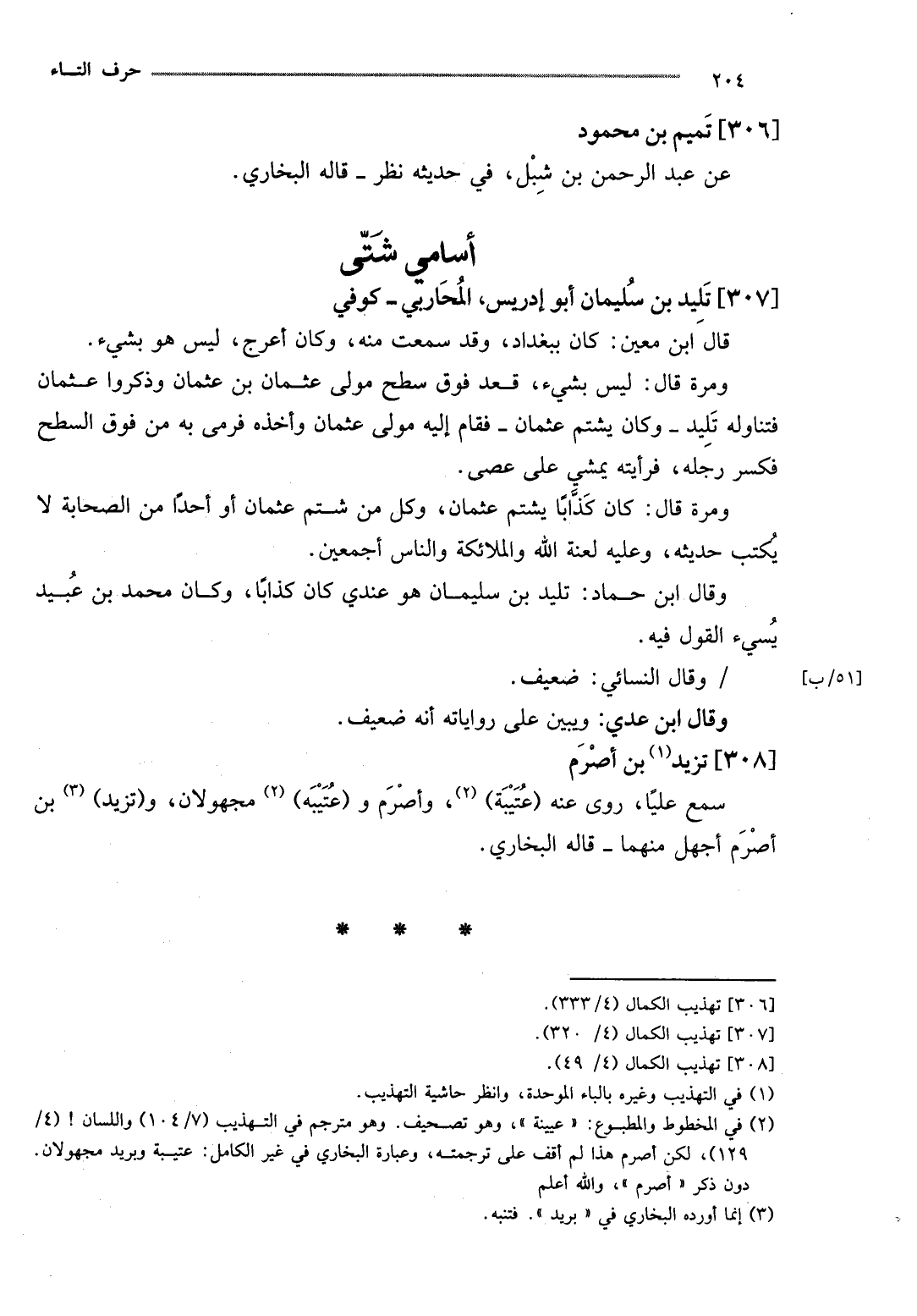 وَمرَّة قَالَ: لَيْسَ بِشَيْء، قعد فَوق سطح مولى عُثْمَان بن عُثْمَان وَذكروا عُثْمَان فتناوله تليد - وَكَانَ يشْتم عُثْمَان - فَقَامَ إِلَيْهِ مولى عُثْمَان وَأَخذه فَرمى بِهِ من فَوق السَّطْح فَكسر رجله، فرأيته يمشي على عصى.