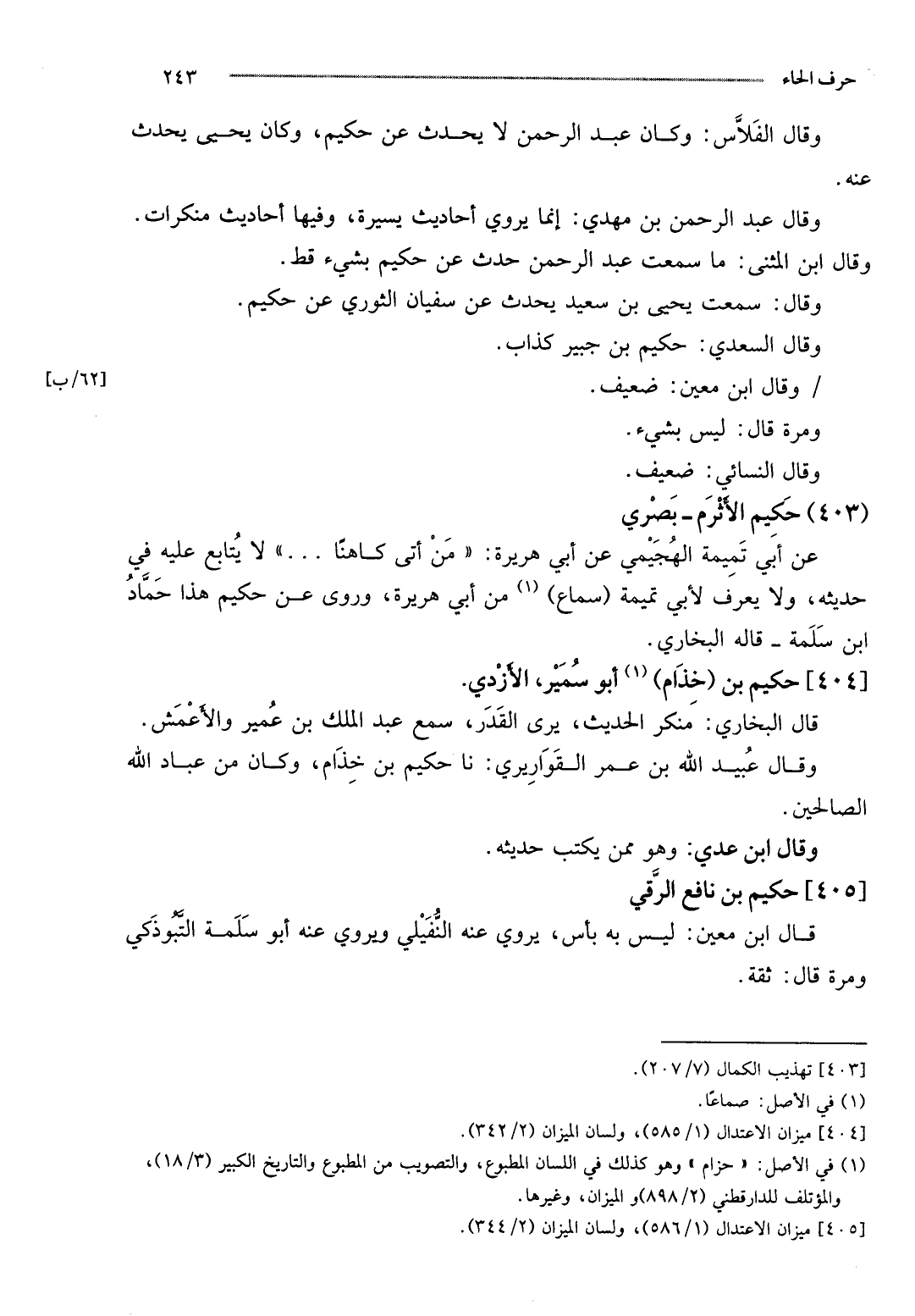 وَقَالَ عبد الرَّحْمَن بن مهْدي: إِنَّمَا يروي أَحَادِيث يسيرَة، وفيهَا أَحَادِيث مُنكرَات. وَقَالَ ابْن الْمثنى: مَا سَمِعت عبد الرَّحْمَن حدث عَن حَكِيم بِشَيْء قطّ.