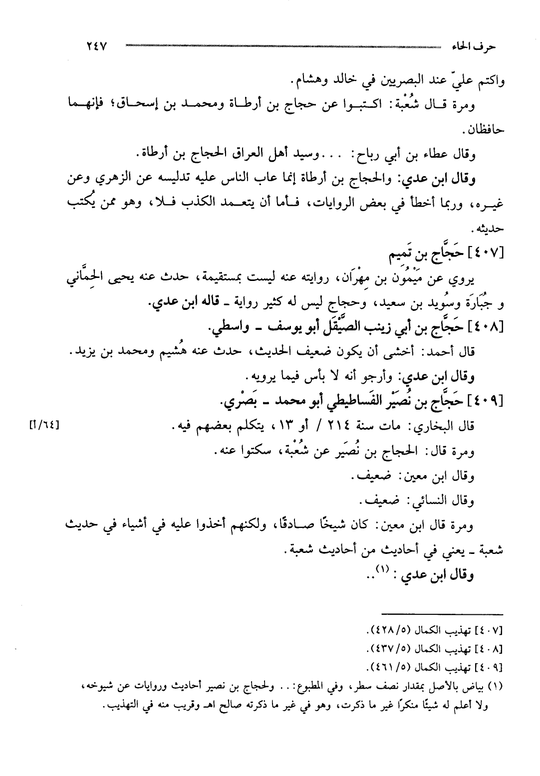 وَقَالَ ابْن عدي: وَالْحجاج بن أَرْطَاة إِنَّمَا عَابَ النَّاس عَلَيْهِ تدليسه عَن الزُّهْرِيّ وَعَن غَيره، وَرُبمَا أَخطَأ فِي بعض الرِّوَايَات، فَأَما أَن يتَعَمَّد الْكَذِب فَلَا، وَهُوَ مِمَّن يكْتب حَدِيثه.