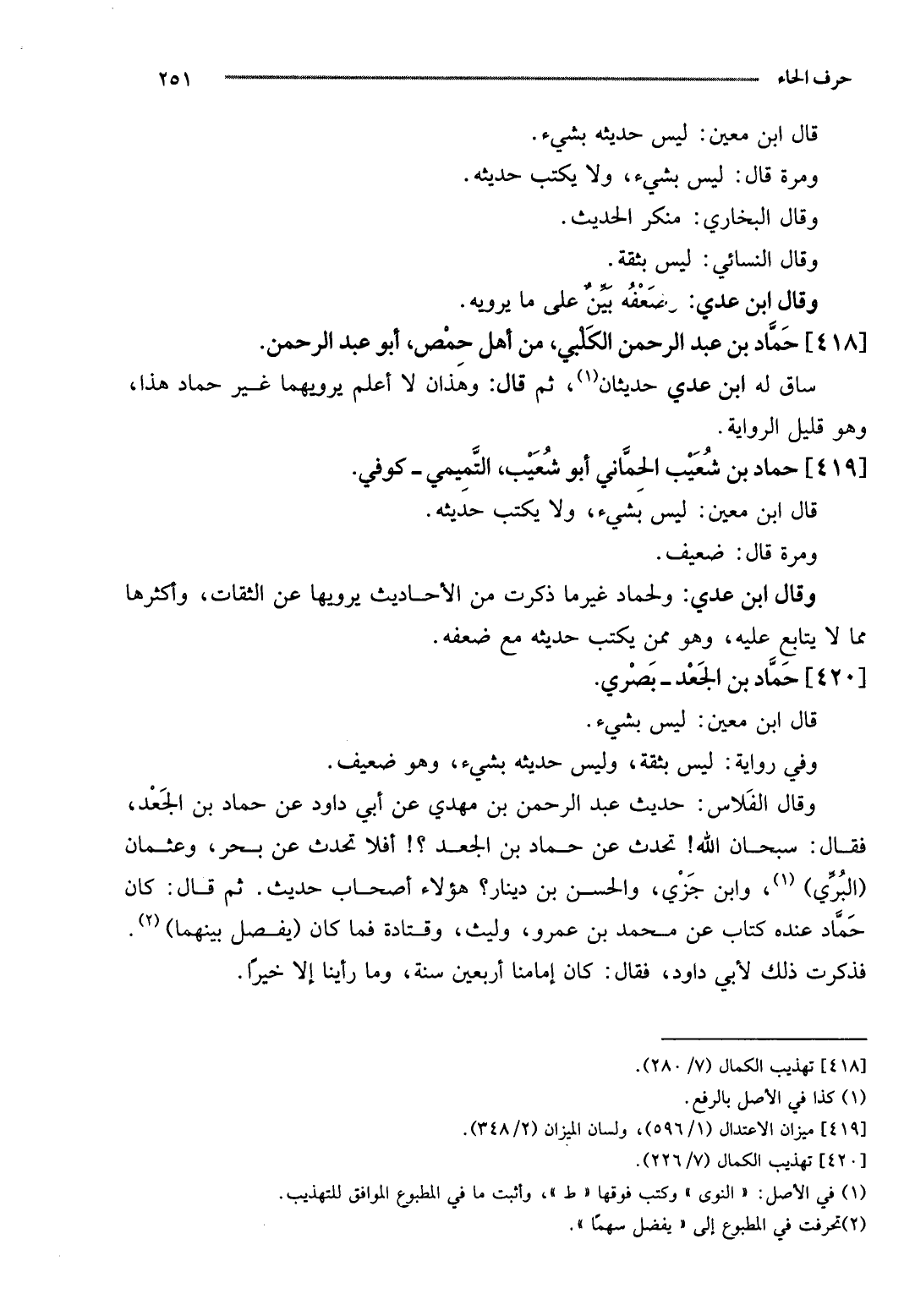 وَقَالَ ابْن عدي: ولحماد غيرما ذكرت من الْأَحَادِيث يَرْوِيهَا عَن الثِّقَات، وأكثرها مِمَّا لَا يُتَابع عَلَيْهِ، وَهُوَ مِمَّن يكْتب حَدِيثه مَعَ ضعفه.