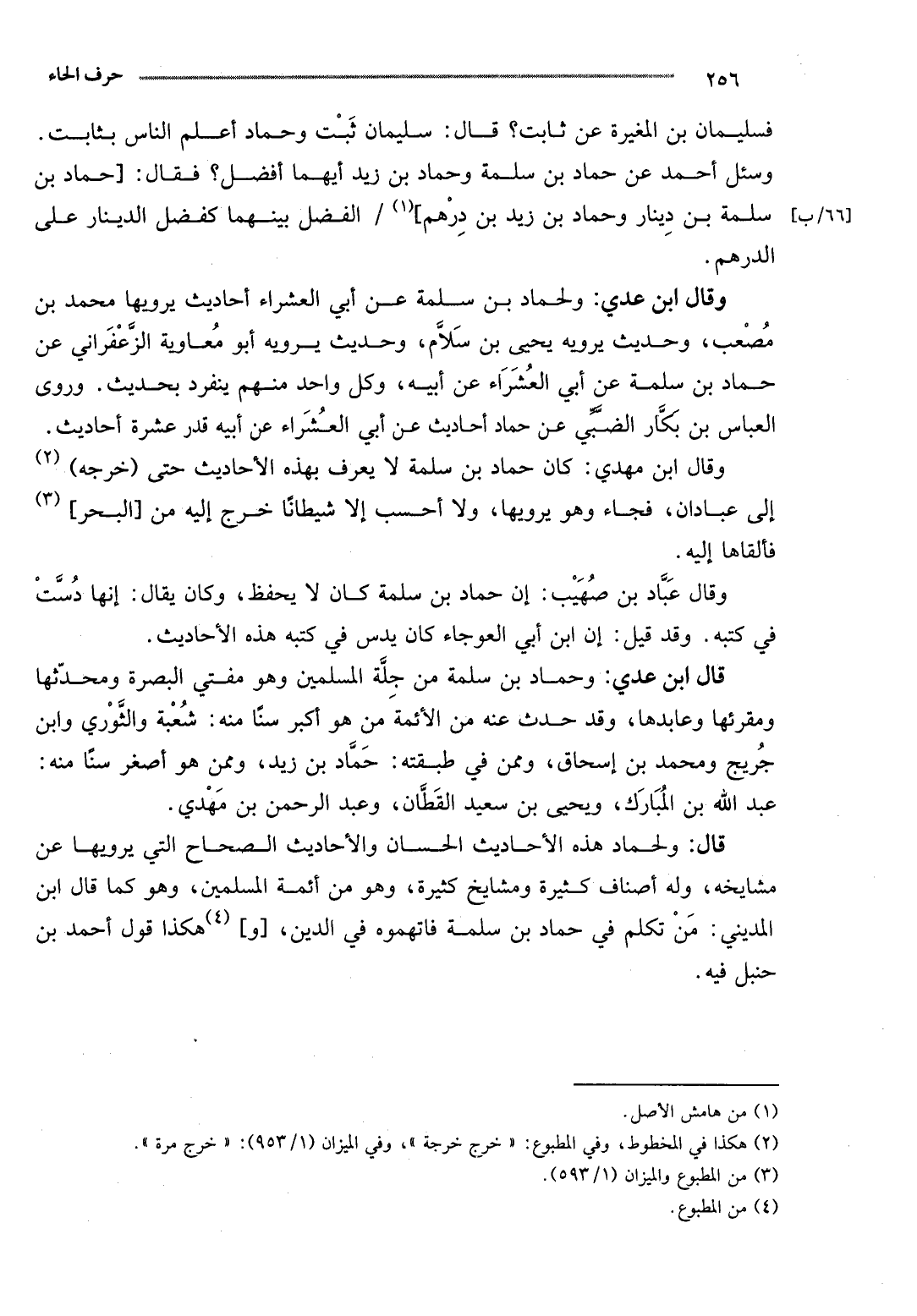 قَالَ: ولحماد هَذِه الْأَحَادِيث الحسان وَالْأَحَادِيث الصِّحَاح الَّتِي يَرْوِيهَا عَن مشايخه، وَله أَصْنَاف كَثِيرَة ومشايخ كَثِيرَة، وَهُوَ من أَئِمَّة الْمُسلمين، وَهُوَ كَمَا قَالَ ابْن الْمَدِينِيّ: من تكلم فِي حَمَّاد بن سَلمَة فاتهموه فِي الدّين، [و] هَكَذَا قَول أَحْمد بن حَنْبَل فِيهِ.