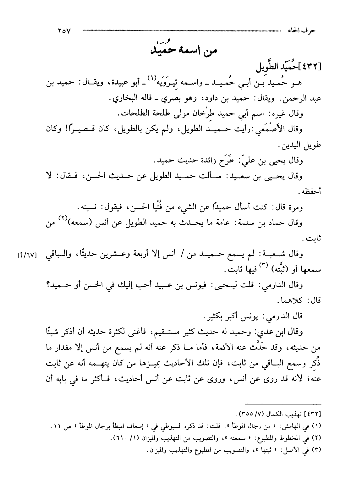 وَقَالَ ابْن عدي: وَحميد لَهُ حَدِيث كثير مُسْتَقِيم، فأغنى لِكَثْرَة حَدِيثه أَن أذكر شَيْئا من حَدِيثه، وَقد حدث عَنهُ الْأَئِمَّة، فَأَما مَا ذكر عَنهُ أَنه لم يسمع من أنس إِلَّا مِقْدَار مَا ذكر وَسمع الْبَاقِي من ثَابت، فَإِن تِلْكَ الْأَحَادِيث يميزها من كَانَ يتهمه أَنه عَن ثَابت عَنهُ؛ لِأَنَّهُ قد روى عَن أنس، وروى عَن ثَابت عَن أنس أَحَادِيث، فَأكْثر مَا فِي بَابه أَن