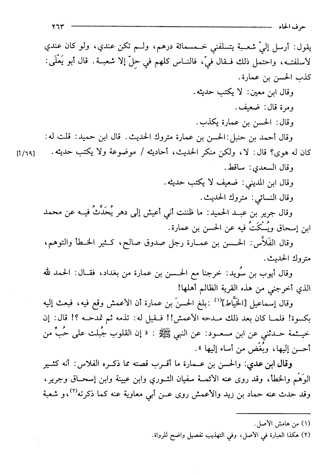 وَقَالَ إِسْمَاعِيل [الْخياط] : بلغ الْحسن بن عمَارَة أَن الْأَعْمَش وَقع فِيهِ، فَبعث إِلَيْهِ بكسوة} فَلَمَّا كَانَ بعد ذَلِك مدحه الْأَعْمَش {} فَقيل لَهُ: تذمه ثمَّ تمدحه؟ ! قَالَ: إِن خَيْثَمَة حَدثنِي عَن ابْن مَسْعُود: عَن النَّبِي - صَلَّى اللَّهُ عَلَيْهِ وَسَلَّم َ -: " إِن الْقُلُوب جبلت على حب من أحسن إِلَيْهَا، وبغض من أَسَاءَ إِلَيْهَا ".