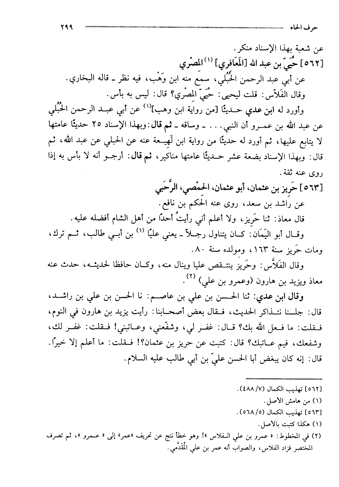 وَقَالَ الفلاس: وحريز ينتقص عليا وينال مِنْهُ، وَكَانَ حَافِظًا لحديثه، حدث عَنهُ معَاذ وَيزِيد بن هَارُون (وَعَمْرو بن عَليّ) .