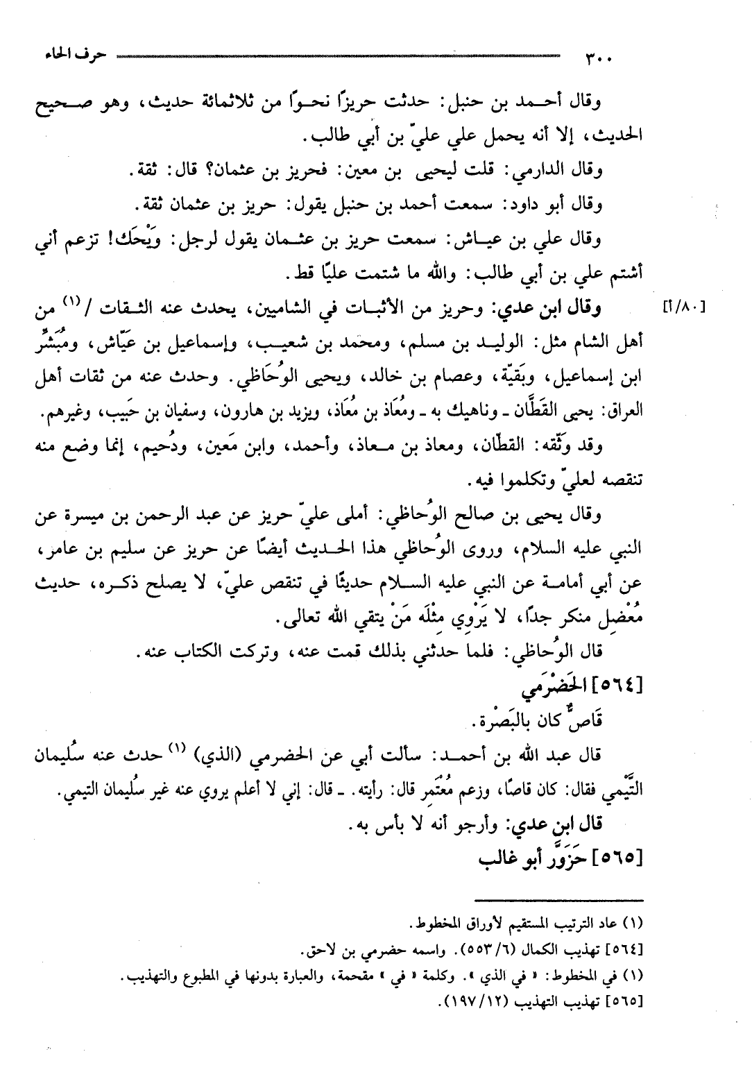وَقَالَ ابْن عدي: وحريز من الْأَثْبَات فِي الشاميين، يحدث عَنهُ الثِّقَات / من أهل الشَّام مثل: الْوَلِيد بن مُسلم، وَمُحَمّد بن شُعَيْب، وَإِسْمَاعِيل بن عَيَّاش، ومبشر ابْن إِسْمَاعِيل، وَبَقِيَّة، وعصام بن خَالِد، وَيحيى الوحاظي. وَحدث عَنهُ من ثِقَات أهل الْعرَاق: يحيى الْقطَّان - وناهيك بِهِ - ومعاذ بن معَاذ، وَيزِيد بن هَارُون، وسُفْيَان بن حبيب، وَغَيرهم.