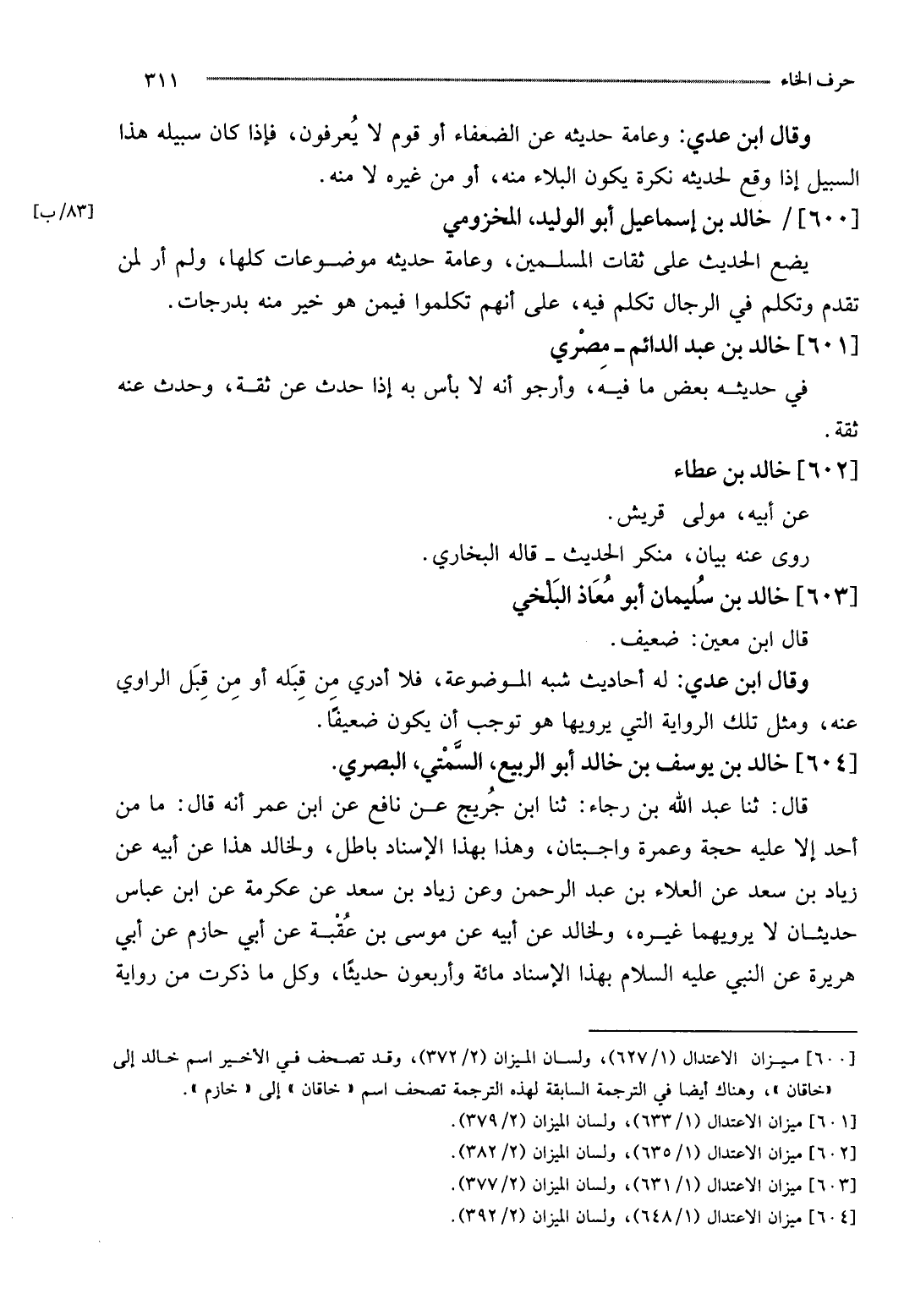 [600] / خَالِد بن إِسْمَاعِيل أَبُو الْوَلِيد، المَخْزُومِي يضع الحَدِيث على ثِقَات الْمُسلمين، وَعَامة حَدِيثه مَوْضُوعَات كلهَا، وَلم أر لمن تقدم وَتكلم فِي الرِّجَال تكلم فِيهِ، على أَنهم تكلمُوا فِيمَن هُوَ خير مِنْهُ بدرجات.