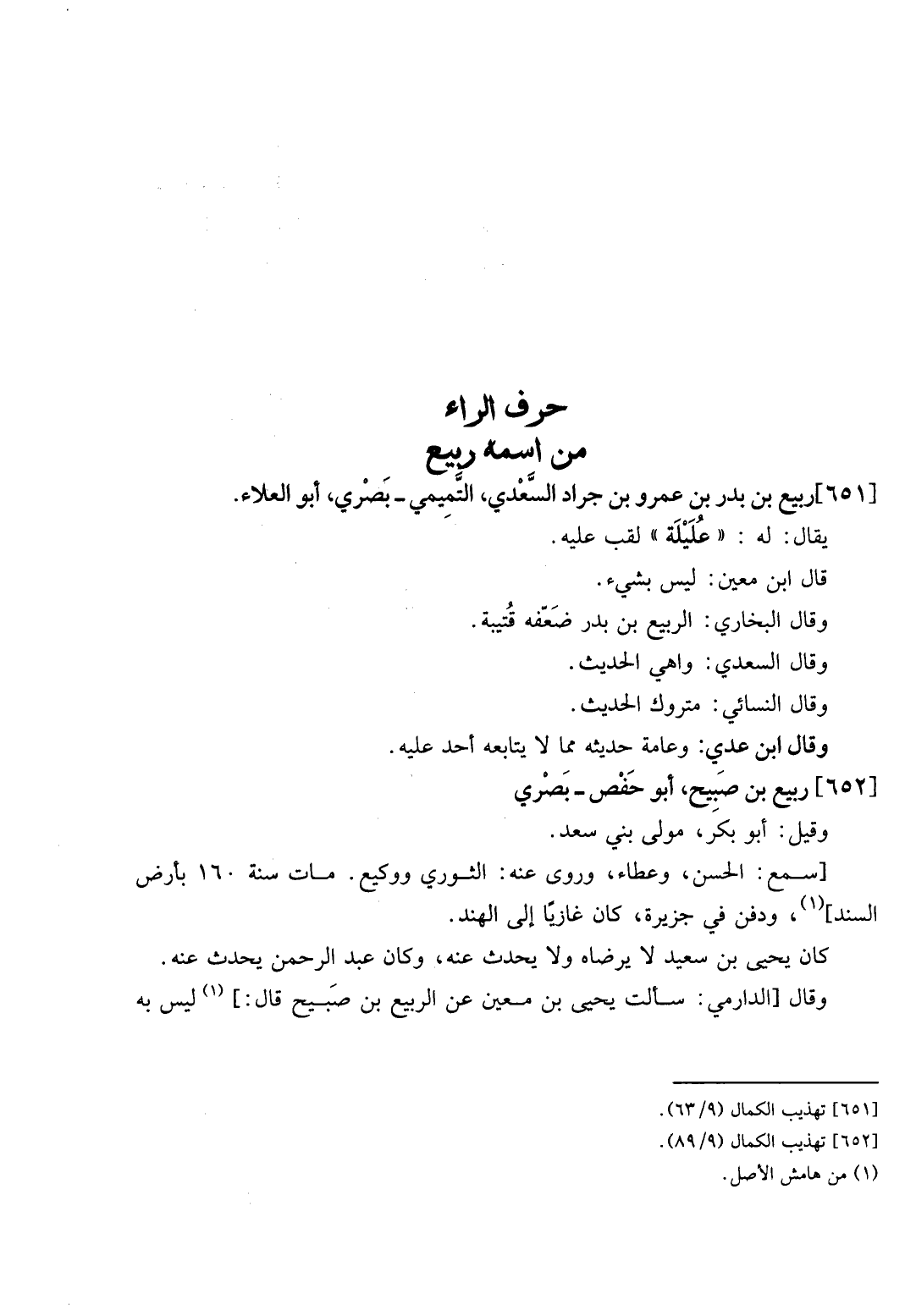 [651] ربيع بن بدر بن عَمْرو بن جَراد السَّعْدِيّ، التَّمِيمِي - بَصرِي، أَبُو الْعَلَاء.