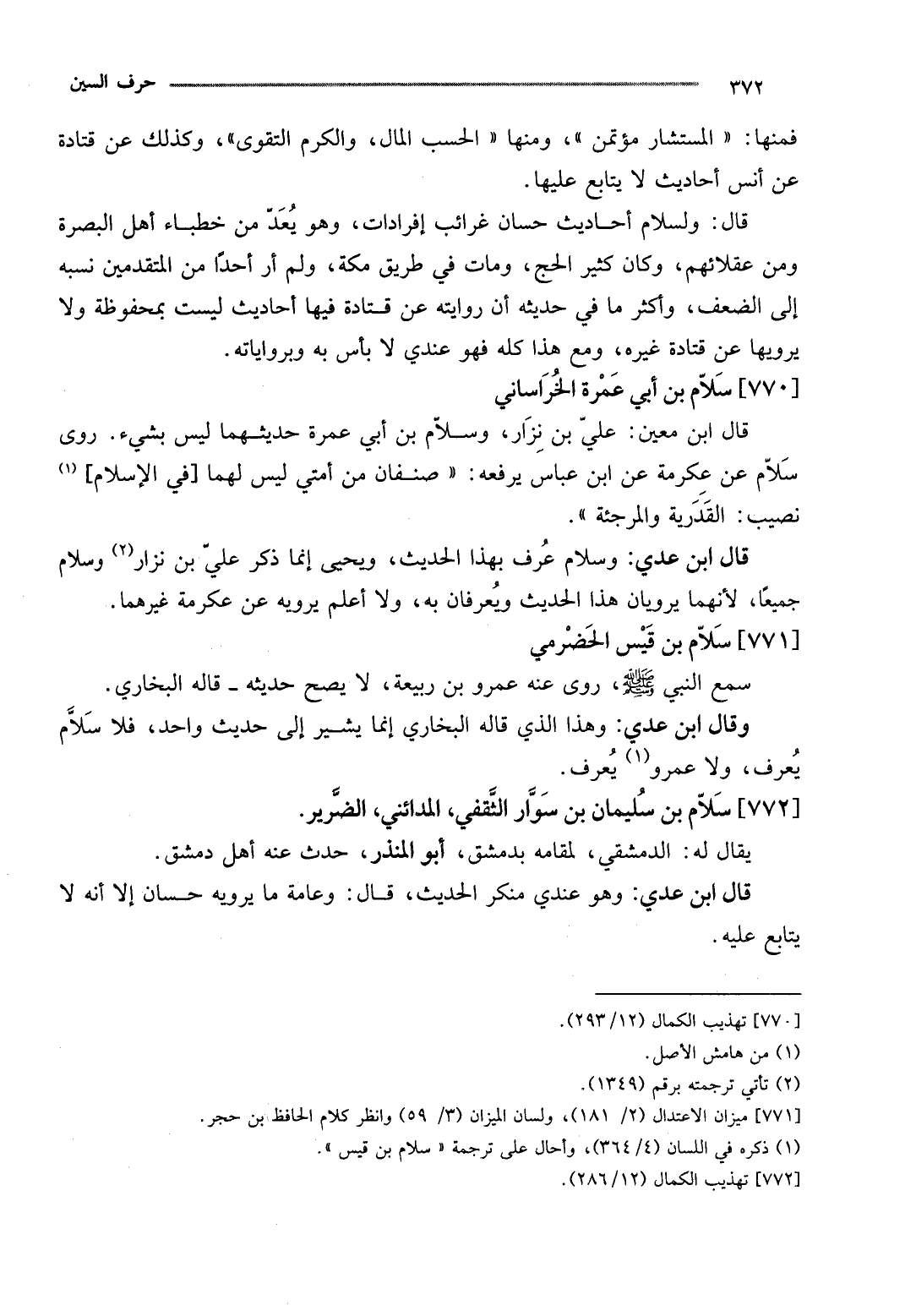 قَالَ: ولسلام أَحَادِيث حسان غرائب إِفْرَادَاتٌ، وَهُوَ يعد من خطباء أهل الْبَصْرَة وَمن عقلائهم، وَكَانَ كثير الْحَج، وَمَات فِي طَرِيق مَكَّة، وَلم أر أحدا من الْمُتَقَدِّمين نسبه إِلَى الضعْف، وَأكْثر مَا فِي حَدِيثه أَن رِوَايَته عَن قَتَادَة فِيهَا أَحَادِيث لَيست بمحفوظة وَلَا يَرْوِيهَا عَن قَتَادَة غَيره، وَمَعَ هَذَا كُله فَهُوَ عِنْدِي لَا بَأْس بِهِ وبرواياته.
