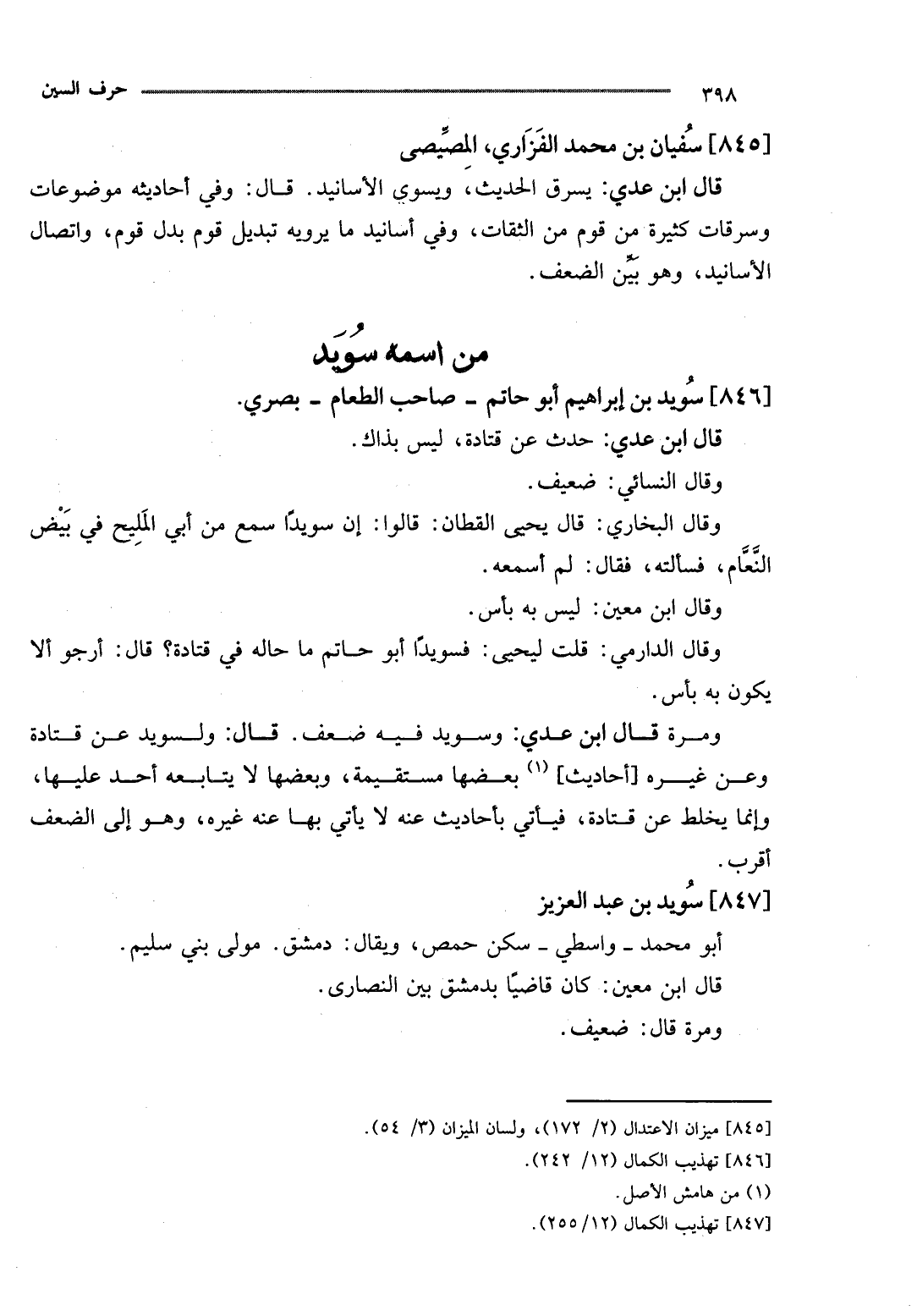 وَمرَّة قَالَ ابْن عدي: وسُويد فِيهِ ضعف. قَالَ: ولسويد عَن قَتَادَة وَعَن غَيره [أَحَادِيث] بَعْضهَا مُسْتَقِيمَة، وَبَعضهَا لَا يُتَابِعه أحد عَلَيْهَا، وَإِنَّمَا يخلط عَن قَتَادَة، فَيَأْتِي بِأَحَادِيث عَنهُ لَا يَأْتِي بهَا عَنهُ غَيره، وَهُوَ إِلَى الضعْف أقرب.