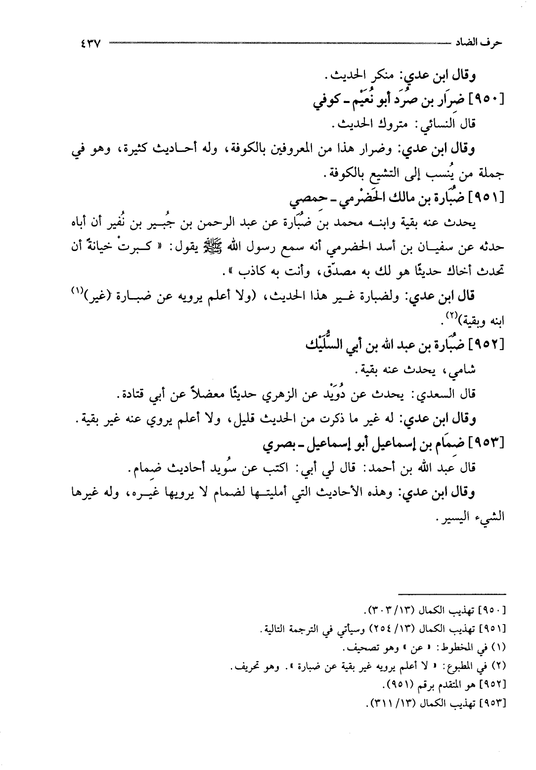 وَقَالَ ابْن عدي: وَضِرَار هَذَا من المعروفين بِالْكُوفَةِ، وَله أَحَادِيث كَثِيرَة، وَهُوَ فِي جملَة من ينْسب إِلَى التَّشَيُّع بِالْكُوفَةِ.