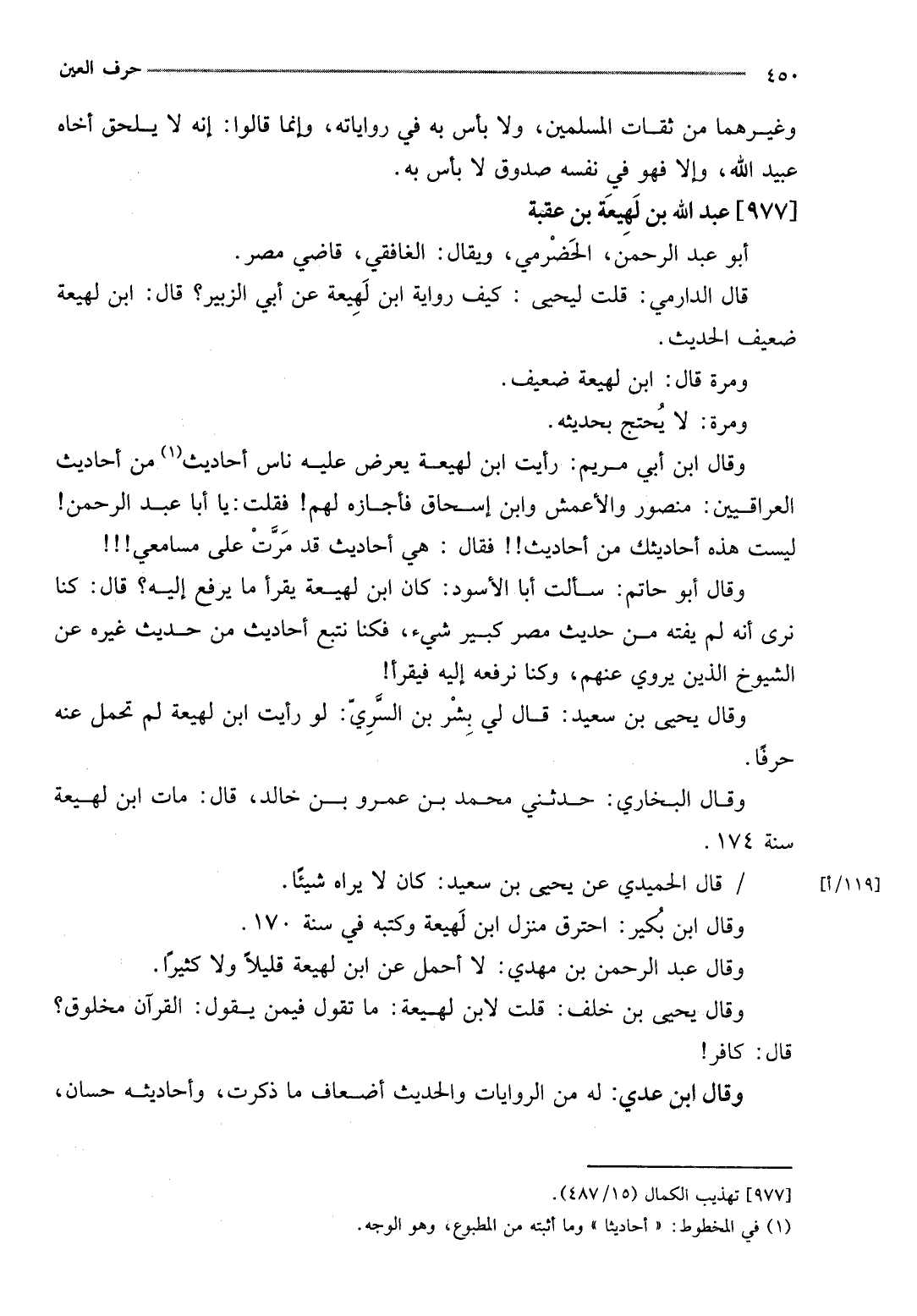 وَقَالَ أَبُو حَاتِم: سَأَلت أَبَا الْأسود: كَانَ ابْن لَهِيعَة يقْرَأ مَا يرفع إِلَيْهِ؟ قَالَ: كُنَّا نرى أَنه لم يفته من حَدِيث مصر كَبِير شَيْء، فَكُنَّا نتبع أَحَادِيث من حَدِيث غَيره عَن الشُّيُوخ الَّذين يروي عَنْهُم، وَكُنَّا نرفعه إِلَيْهِ فَيقْرَأ}