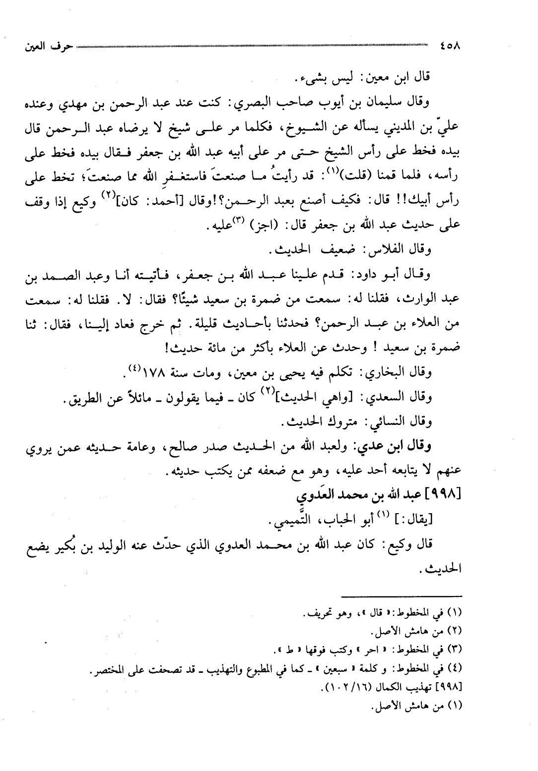 وَقَالَ سُلَيْمَان بن أَيُّوب صَاحب الْبَصْرِيّ: كنت عِنْد عبد الرَّحْمَن بن مهْدي وَعِنْده عَليّ بن الْمَدِينِيّ يسْأَله عَن الشُّيُوخ، فَكلما مر على شيخ لَا يرضاه عبد الرَّحْمَن قَالَ بِيَدِهِ فَخط على رَأس الشَّيْخ حَتَّى مر على أَبِيه عبد الله بن جَعْفَر فَقَالَ بِيَدِهِ فَخط على رَأسه، فَلَمَّا قمنا (قلت) : قد رَأَيْت مَا صنعت فَاسْتَغْفر الله مِمَّا صنعت؛ تخط على رَأس أَبِيك {} قَالَ: فيكف أصنع بِعَبْد الرَّحْمَن؟ {وَقَالَ [أَحْمد: كَانَ] وَكِيع إِذا وقف على حَدِيث عبد الله بن جَعْفَر قَالَ: (اجز) عَلَيْهِ.