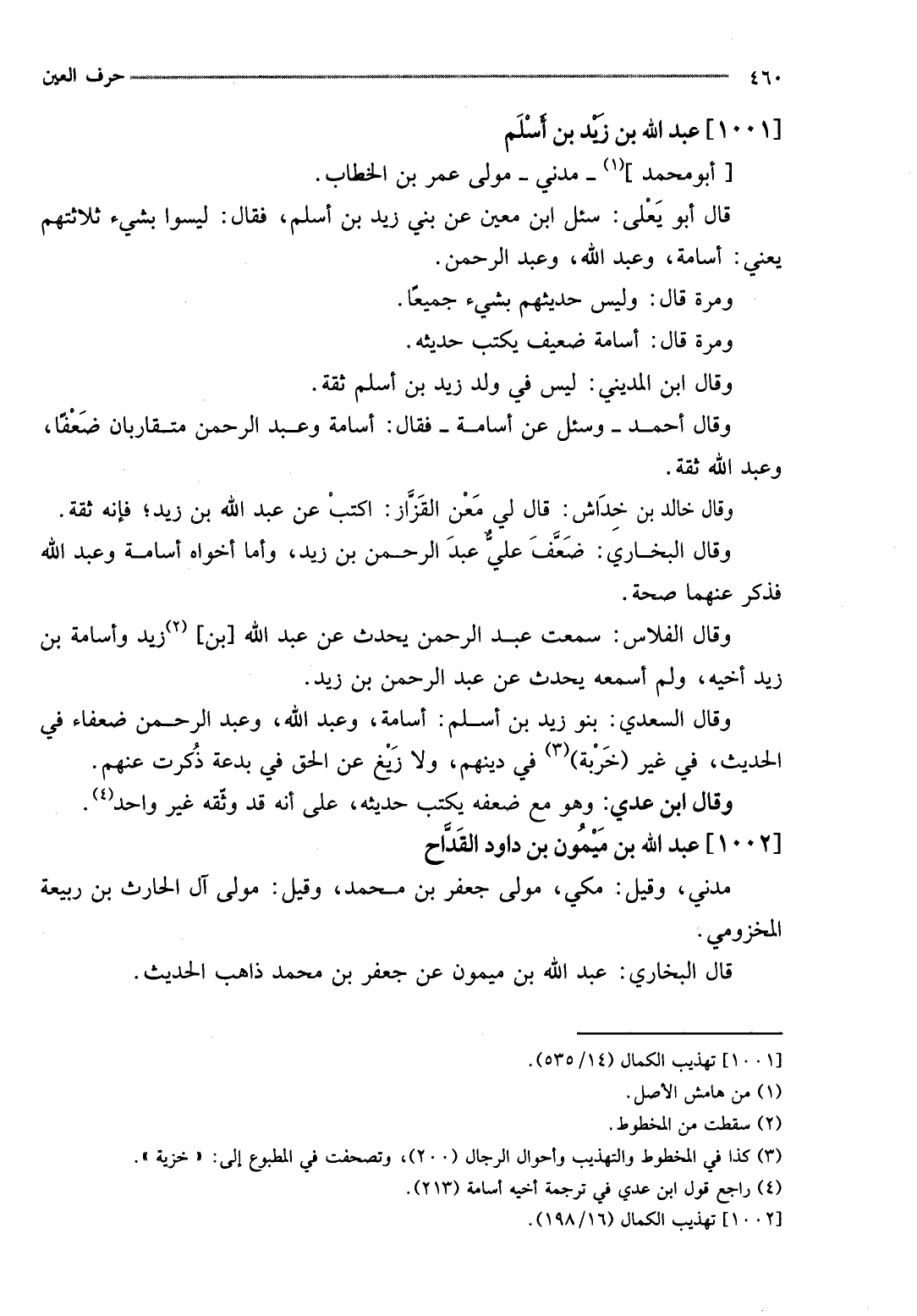 وَقَالَ السَّعْدِيّ: بَنو زيد بن أسلم: أُسَامَة، وَعبد الله، وَعبد الرَّحْمَن ضعفاء فِي الحَدِيث، فِي غير (خربة) فِي دينهم، وَلَا زيغ عَن الْحق فِي بِدعَة ذكرت عَنْهُم.