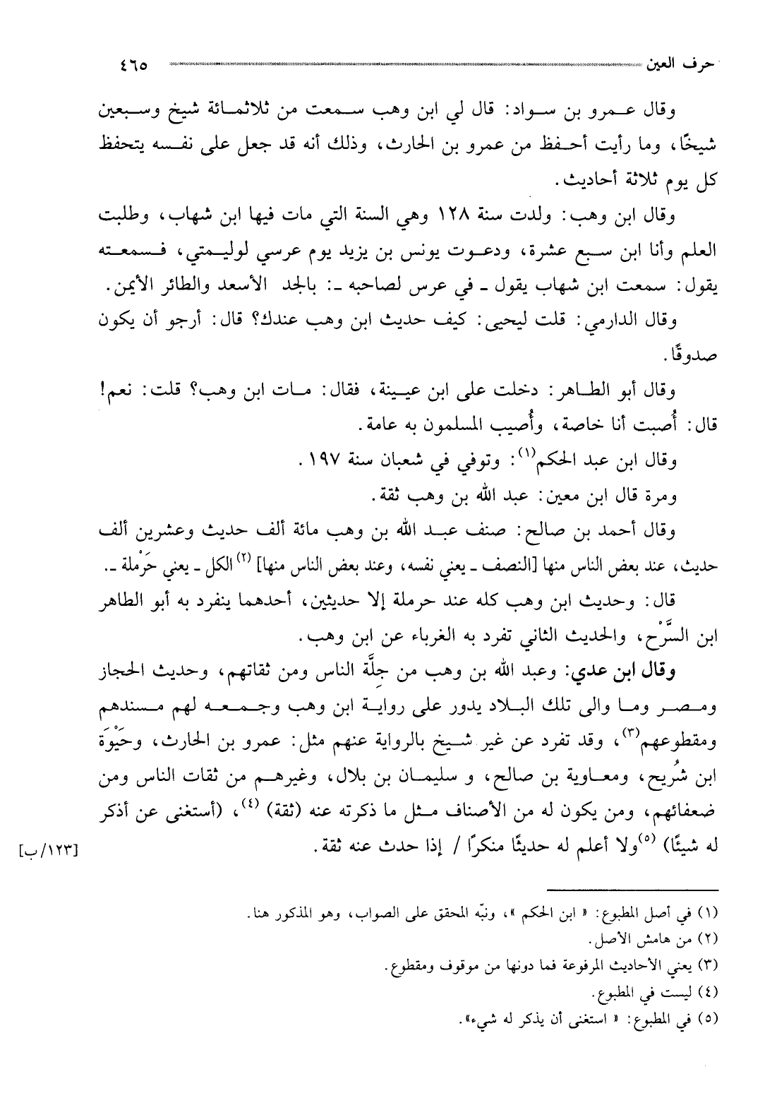 وَقَالَ أَحْمد بن صَالح: صنف عبد الله بن وهب مائَة ألف حَدِيث وَعشْرين ألف حَدِيث، عِنْد بعض النَّاس مِنْهَا [النّصْف - يَعْنِي نَفسه، وَعند بعض النَّاس مِنْهَا] الْكل - يَعْنِي حَرْمَلَة -.