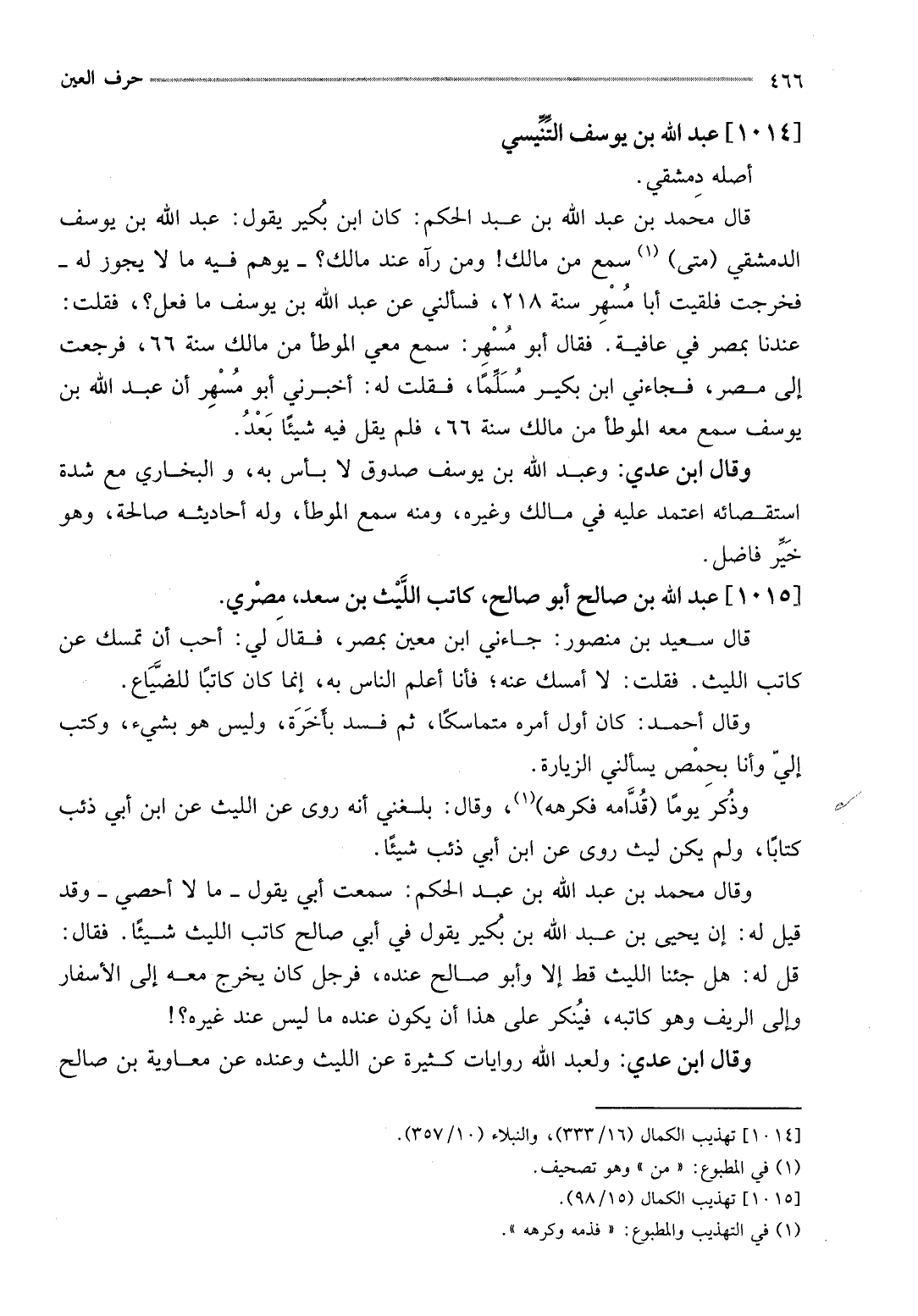 قَالَ سعيد بن مَنْصُور: جَاءَنِي ابْن معِين بِمصْر، فَقَالَ لي: أحب أَن تمسك عَن كَاتب اللَّيْث. فَقلت: لَا أمسك عَنهُ؛ فَأَنا أعلم النَّاس بِهِ، إِنَّمَا كَانَ كَاتبا للضياع.