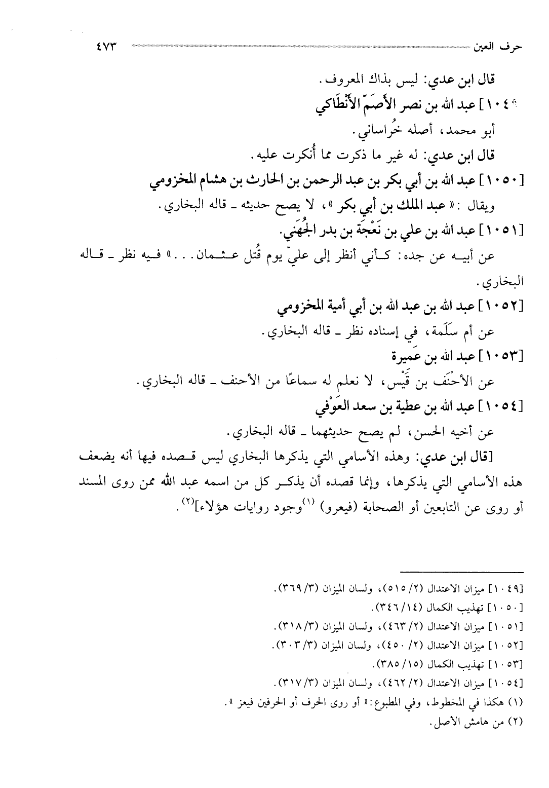 [قَالَ ابْن عدي: وَهَذِه الْأَسَامِي الَّتِي يذكرهَا البُخَارِيّ لَيْسَ قَصده فِيهَا أَنه يضعف هَذِه الْأَسَامِي الَّتِي يذكرهَا، وَإِنَّمَا قَصده أَن يذكر كل من اسْمه عبد الله مِمَّن روى الْمسند أَو روى عَن التَّابِعين أَبُو الصَّحَابَة (فيعرو) وجود رِوَايَات هَؤُلَاءِ] .