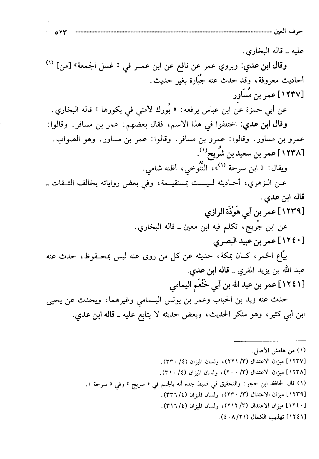 وَقَالَ ابْن عدي: ويروي عمر عَن نَافِع عَن ابْن عمر " فِي غسل الْجُمُعَة " [من] أَحَادِيث مَعْرُوفَة، وَقد حدث عَنهُ جبارَة بِغَيْر حَدِيث.