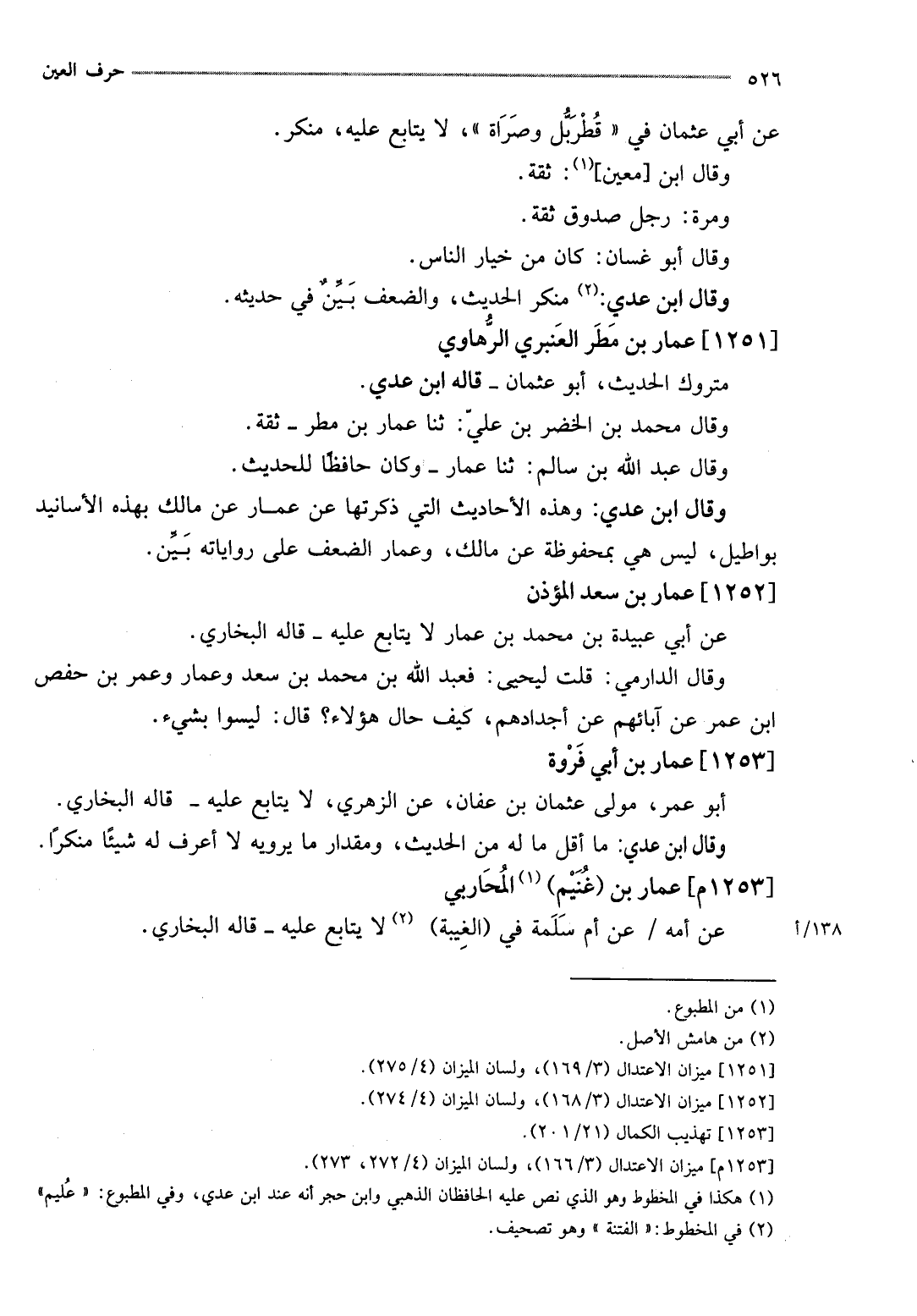 وَقَالَ ابْن عدي: وَهَذِه الْأَحَادِيث الَّتِي ذكرتها عَن عمار عَن مَالك بِهَذِهِ الْأَسَانِيد بَوَاطِيلُ، لَيْسَ هِيَ بمحفوظة عَن مَالك، وعمار الضعْف على رواياته بَين.