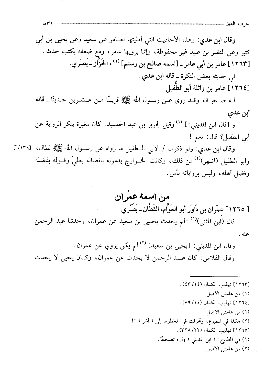 وَقَالَ ابْن عدي: وَلَو ذكرت / لأبي الطُّفَيْل مَا رَوَاهُ عَن رَسُول الله - صَلَّى اللَّهُ عَلَيْهِ وَسَلَّم َ - لطال، وَأَبُو الطُّفَيْل (أشهر) من ذَلِك، وَكَانَت الْخَوَارِج يذمونه باتصاله بعلي وَقَوله بفضله وَفضل أَهله، وَلَيْسَ بِرِوَايَاتِهِ بَأْس.