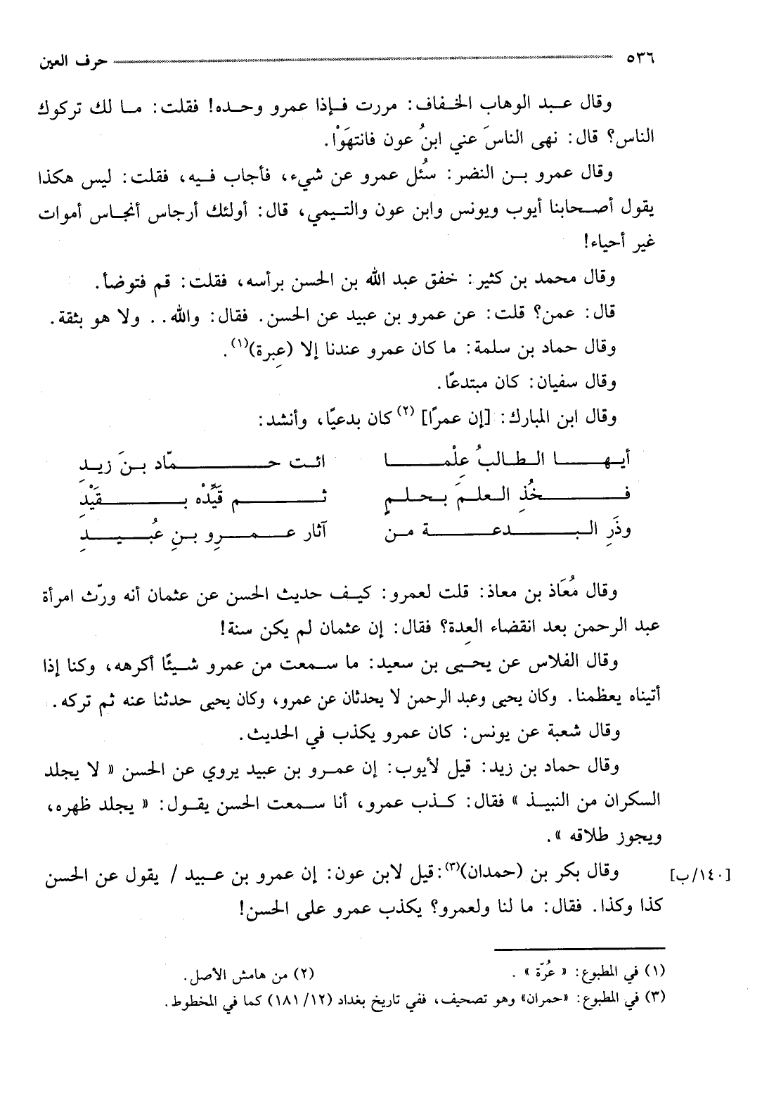وَقَالَ بكر بن (حمدَان) : قيل لِابْنِ عون: إِن عَمْرو بن عبيد / يَقُول عَن الْحسن كَذَا وَكَذَا. فَقَالَ: مَا لنا ولعمرو؟ يكذب عَمْرو على الْحسن}