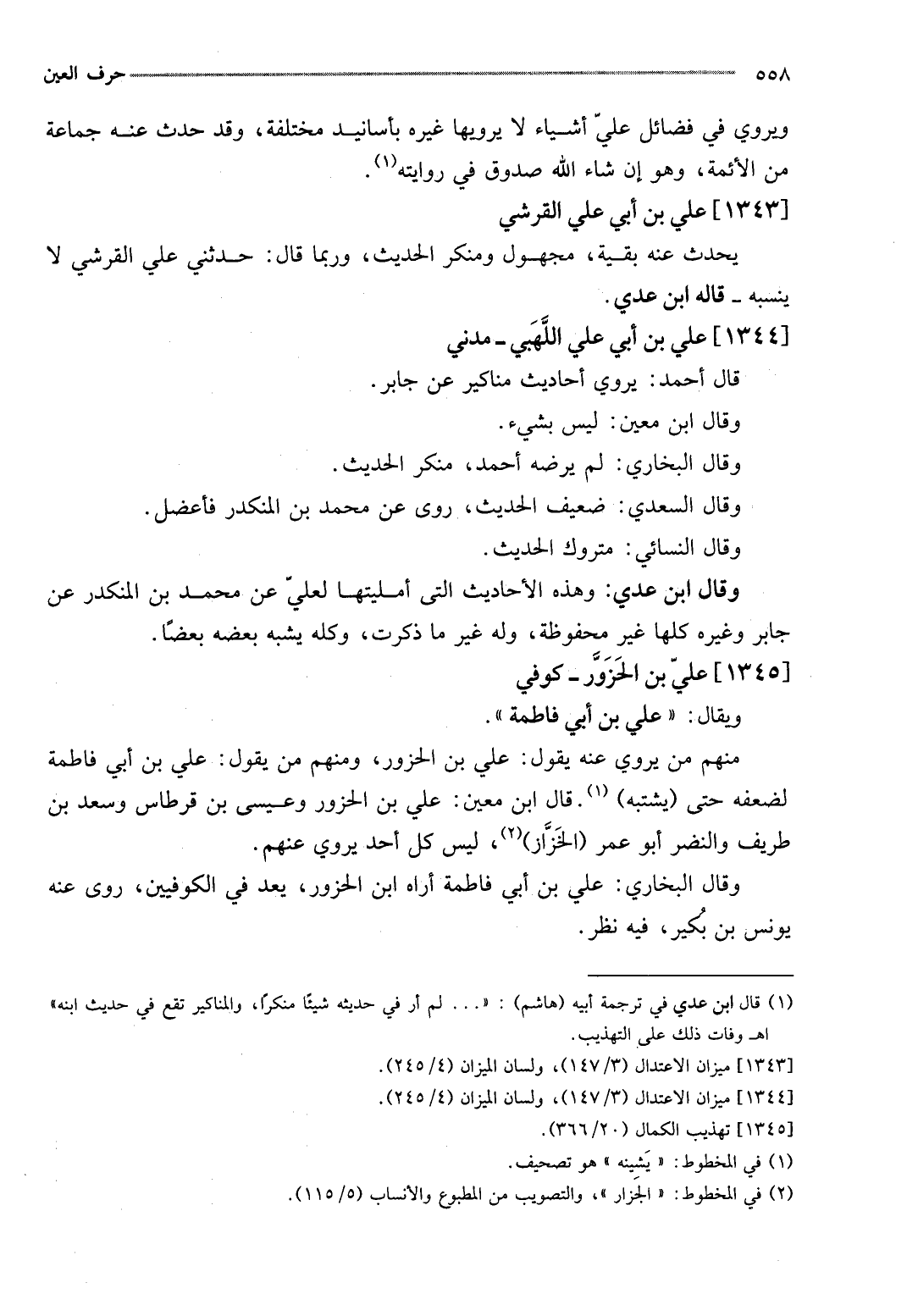 مِنْهُم من يروي عَنهُ يَقُول: عَليّ بن الحزور، وَمِنْهُم من يَقُول: عَليّ بن أبي فَاطِمَة لضَعْفه حَتَّى (يشْتَبه) . قَالَ ابْن معِين: عَليّ بن الحزور وَعِيسَى بن قرطاس وَسعد بن طريف وَالنضْر أَبُو عمر (الخزاز) ، لَيْسَ كل أحد يروي عَنْهُم.