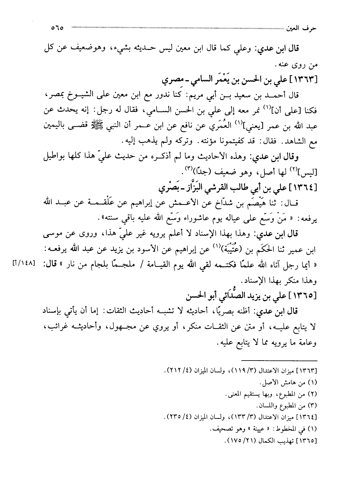 قَالَ ابْن عدي: وَهَذَا بِهَذَا الْإِسْنَاد لَا أعلم يرويهِ غير عَليّ هَذَا، وروى عَن مُوسَى ابْن عُمَيْر ثَنَا الحكم بن (عتيبة) عَن إِبْرَاهِيم عَن الْأسود بن يزِيد عَن عبد الله يرفعهُ: " أَيّمَا رجل آتَاهُ الله علما فكتمه لَقِي الله يَوْم الْقِيَامَة / مُلجمًا بلجام من نَار " قَالَ: وَهَذَا مُنكر بِهَذَا الْإِسْنَاد.