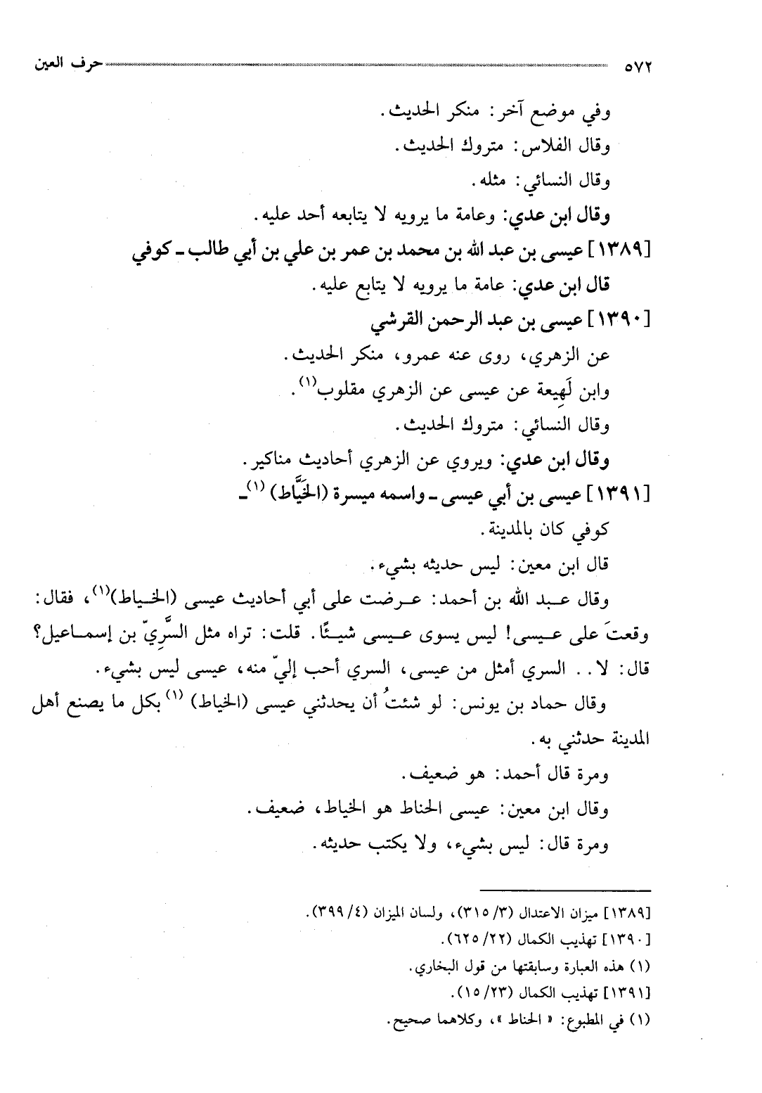 وَقَالَ ابْن معِين: عِيسَى الحناط هُوَ الْخياط، ضَعِيف.