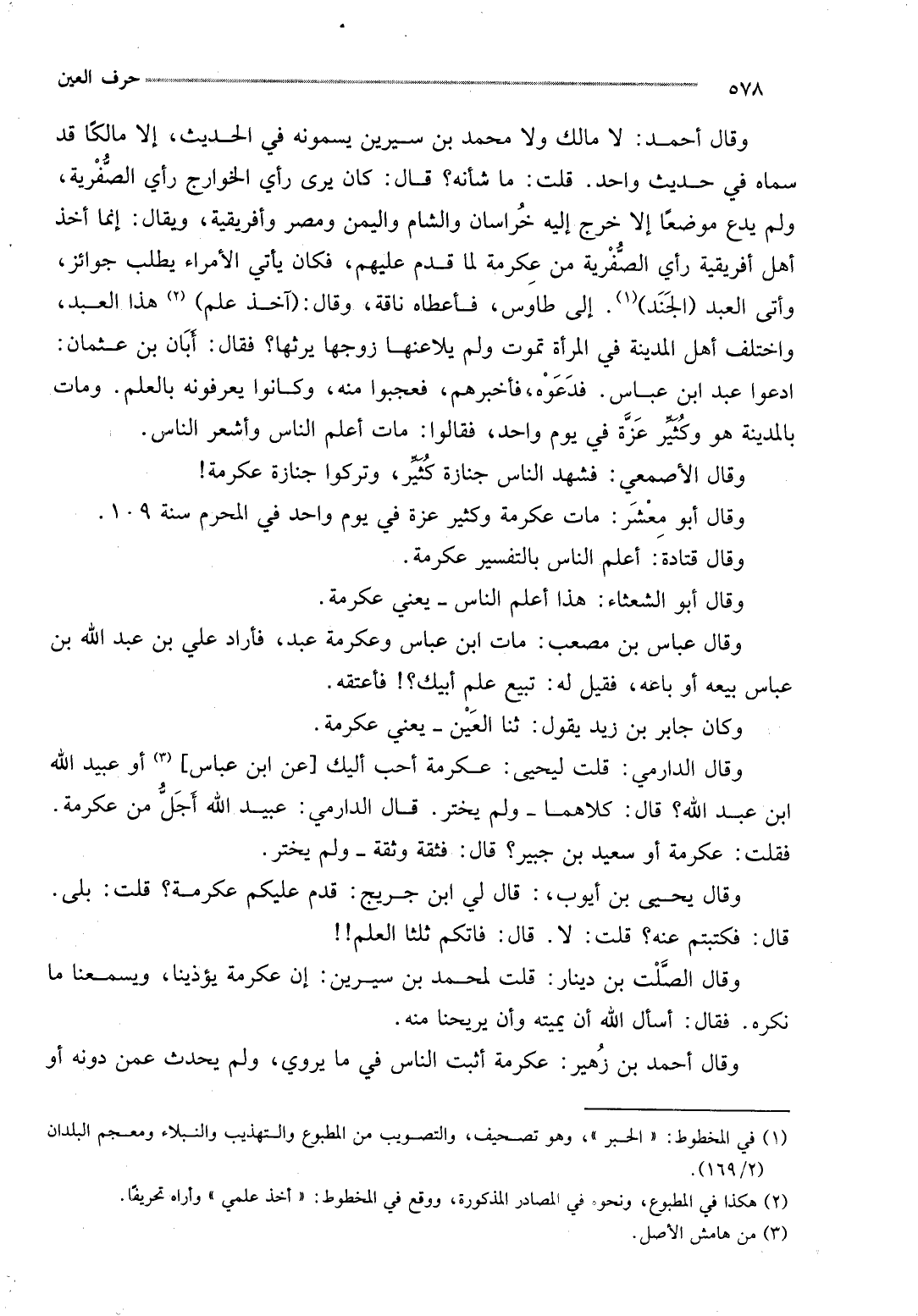 وَقَالَ أَحْمد: لَا مَالك وَلَا مُحَمَّد بن سِيرِين يسمونه فِي الحَدِيث، إِلَّا مَالِكًا قد سَمَّاهُ فِي حَدِيث وَاحِد. قلت: مَا شَأْنه؟ قَالَ: كَانَ يرى رَأْي الْخَوَارِج رَأْي الصفرية، وَلم يدع موضعا إِلَّا خرج إِلَيْهِ خُرَاسَان وَالشَّام واليمن ومصر وأفريقية، وَيُقَال: إِنَّمَا أَخذ أهل أفريقية رَأْي الصفرية من عِكْرِمَة لما قدم عَلَيْهِم، فَكَانَ يَأْتِي الْأُمَرَاء يطْلب جوائز، وأتى العَبْد (الْجند) . إِلَى طَاوس، فَأعْطَاهُ نَاقَة، وَقَالَ: (آخذ علم) هَذَا العَبْد، وَاخْتلف أهل الْمَدِينَة فِي الْمَرْأَة تَمُوت وَلم يلاعنها زَوجهَا يَرِثهَا؟ فَقَالَ: أبان بن عُثْمَان: ادعوا عبد ابْن عَبَّاس. فَدَعوهُ، فَأخْبرهُم، فعجبوا مِنْهُ، وَكَانُوا يعرفونه بِالْعلمِ. وَمَات بِالْمَدِينَةِ هُوَ وَكثير عزة فِي يَوْم وَاحِد، فَقَالُوا: مَاتَ أعلم النَّاس وأشعر النَّاس.