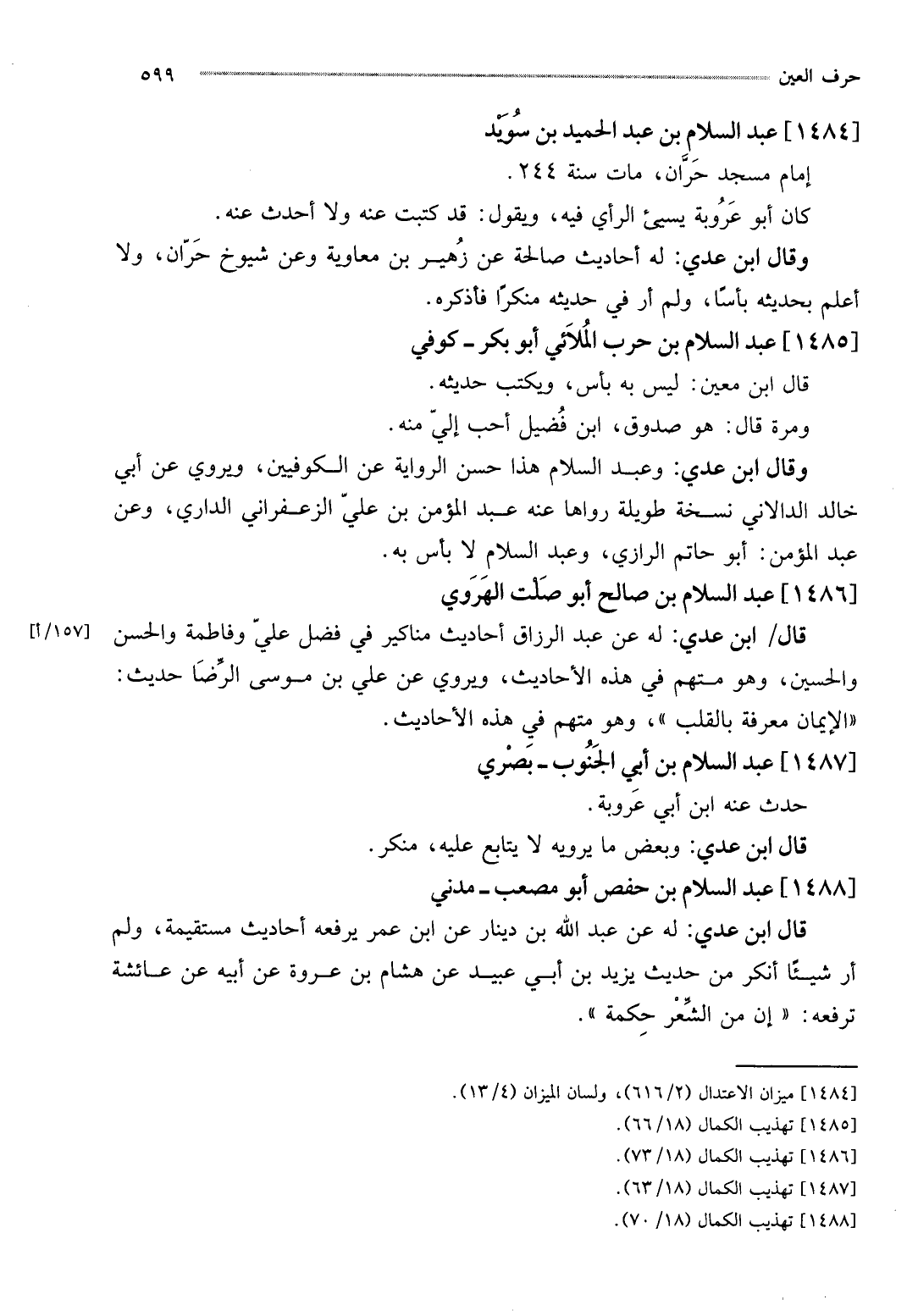 وَقَالَ ابْن عدي: وَعبد السَّلَام هَذَا حسن الرِّوَايَة عَن الْكُوفِيّين، ويروي عَن أبي خَالِد الدالاني نُسْخَة طَوِيلَة رَوَاهَا عَنهُ عبد الْمُؤمن بن عَليّ الزَّعْفَرَانِي الدَّارِيّ، وَعَن عبد الْمُؤمن: أَبُو حَاتِم الرَّازِيّ، وَعبد السَّلَام لَا بَأْس بِهِ.