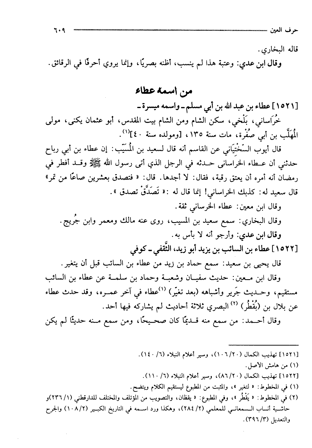 وَقَالَ ابْن معِين: حَدِيث سُفْيَان وَشعْبَة وَحَمَّاد بن سَلمَة عَن عَطاء بن السَّائِب مُسْتَقِيم، وَحَدِيث جرير وأشباهه (بعد تغير) عَطاء فِي آخر عمره، وَقد حدث عَطاء عَن بِلَال بن (بقطر) الْبَصْرِيّ ثَلَاثَة أَحَادِيث لم يُشَارِكهُ فِيهَا أحد.