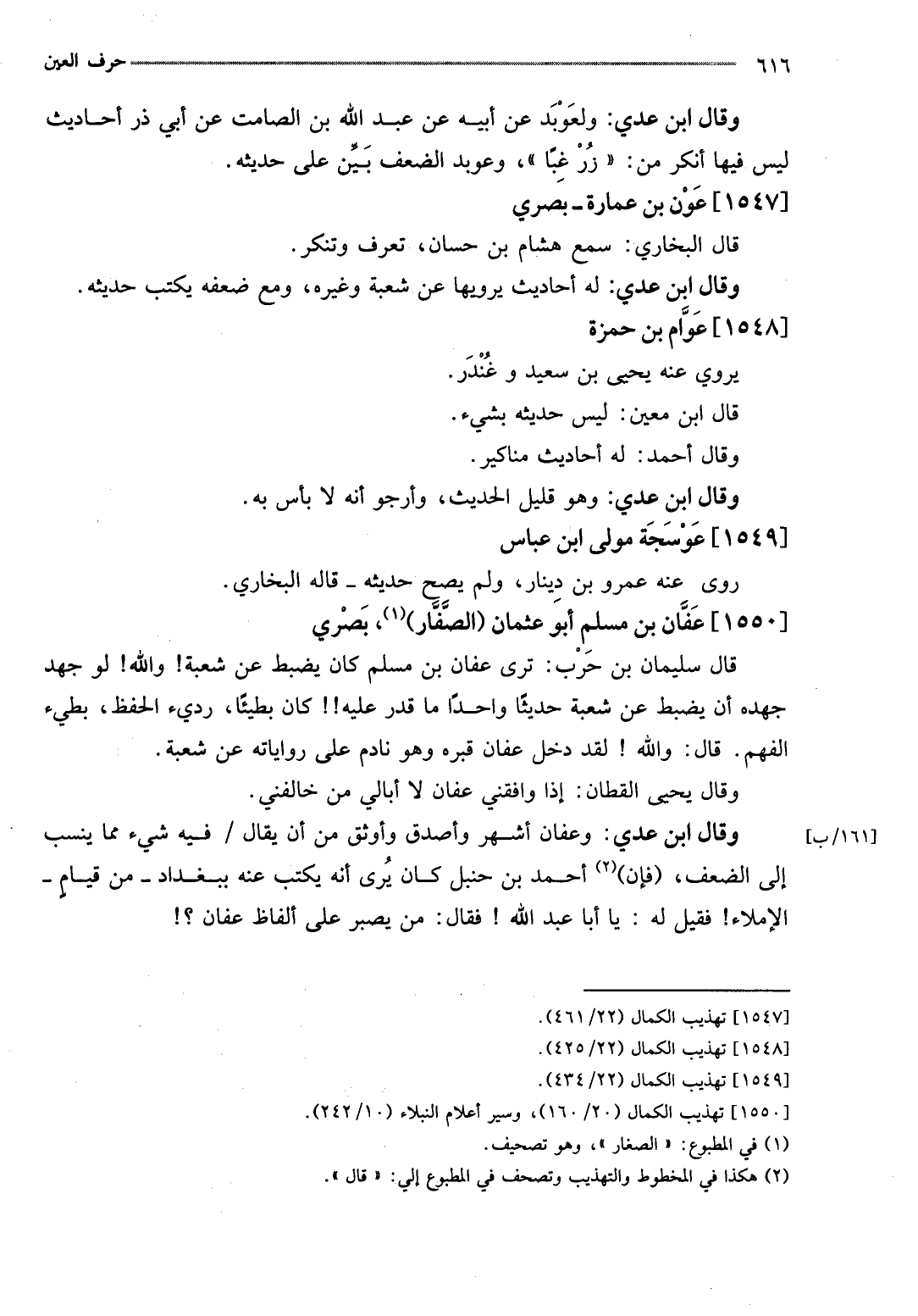 وَقَالَ ابْن عدي: وَعَفَّان أشهر وأصدق وأوثق من أَن يُقَال: فِيهِ شَيْء مِمَّا ينْسب إِلَى الضعْف، (فَإِن) أَحْمد بن حَنْبَل كَانَ يرى أَنه يكْتب عَنهُ بِبَغْدَاد - من قيام - الْإِمْلَاء} فَقيل لَهُ: يَا أَبَا عبد الله {فَقَالَ: من يصبر على أَلْفَاظ عَفَّان؟}