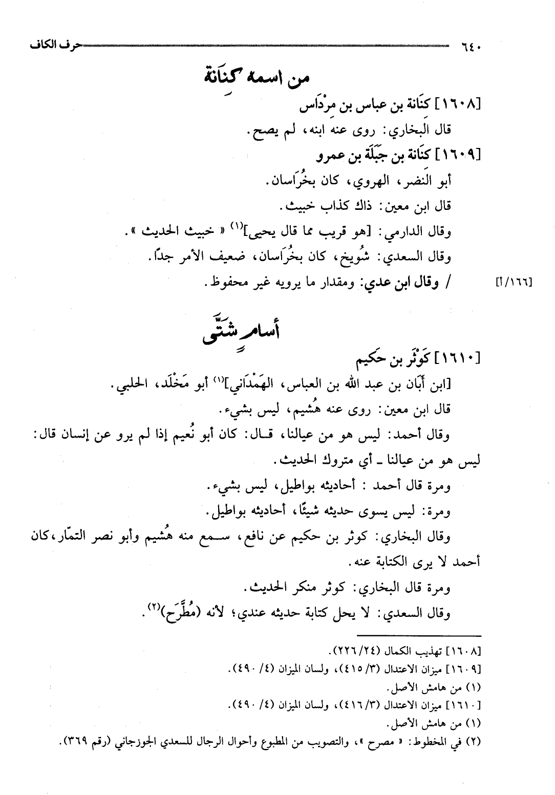 وَمرَّة قَالَ البُخَارِيّ: كوثر مُنكر الحَدِيث.