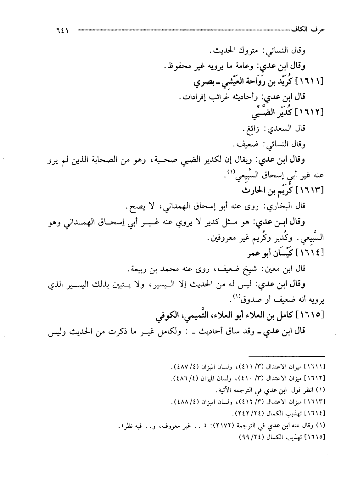 وَقَالَ ابْن عدي: هُوَ مثل كدير لَا يروي عَنهُ غير أبي إِسْحَاق الْهَمدَانِي وَهُوَ السبيعِي. وكدير وكريم غير معروفين.