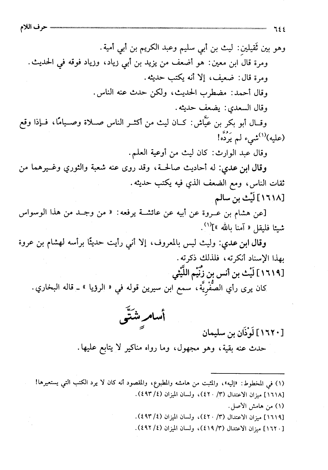وَقَالَ ابْن عدي: وَلَيْث لَيْسَ بِالْمَعْرُوفِ، إِلَّا أَنِّي رَأَيْت حَدِيثا بِرَأْسِهِ لهشام بن عُرْوَة بِهَذَا الْإِسْنَاد أنكرته، فَلذَلِك ذكرته.