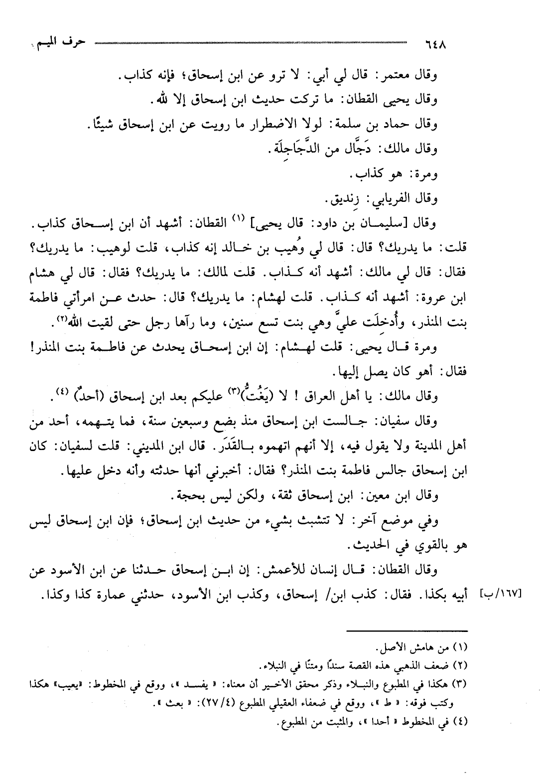 وَفِي مَوضِع آخر: لَا تتشبث بِشَيْء من حَدِيث ابْن إِسْحَاق، فَإِن ابْن إِسْحَاق لَيْسَ هُوَ بِالْقَوِيّ فِي الحَدِيث.