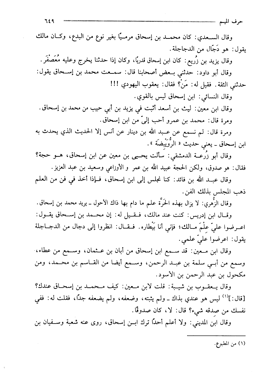 وَقَالَ السَّعْدِيّ: كَانَ مُحَمَّد بن إِسْحَاق مرميا بِغَيْر نوع من الْبدع، وَكَانَ مَالك يَقُول: هُوَ دجال من الدجاجلة.
