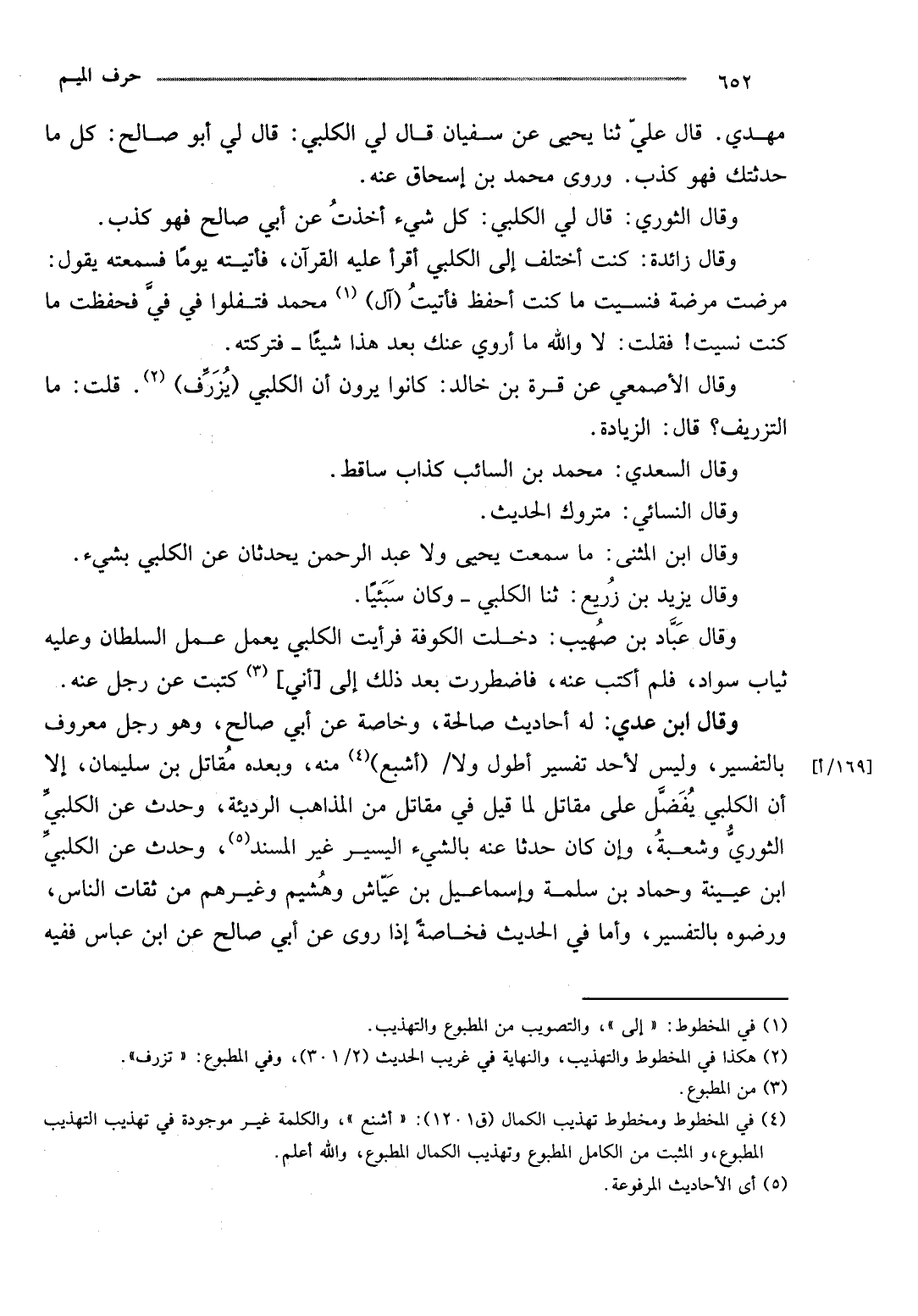 مهْدي. قَالَ عَليّ ثَنَا يحيى عَن سُفْيَان قَالَ لي الْكَلْبِيّ: قَالَ لي أَبُو صَالح: كل مَا حدثتك فَهُوَ كذب. وروى مُحَمَّد بن إِسْحَاق عَنهُ.