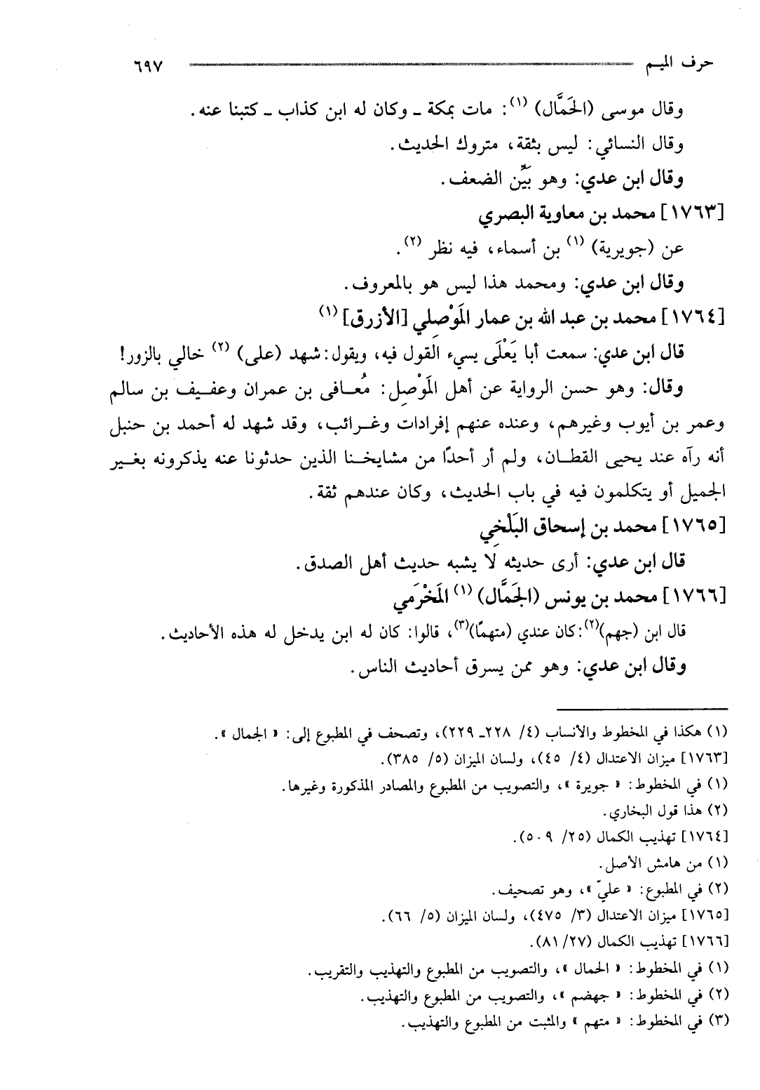 وَقَالَ: وَهُوَ حسن الرِّوَايَة عَن أهل الْموصل: معافى بن عمرَان وعفيف بن سَالم وَعمر بن أَيُّوب وَغَيرهم، وَعِنْده عَنْهُم إِفْرَادَاتٌ وغرائب، وَقد شهد لَهُ أَحْمد بن حَنْبَل أَنه رَآهُ عِنْد يحيى الْقطَّان، وَلم أر أحدا من مَشَايِخنَا الَّذين حدثونا عَنهُ يذكرُونَهُ بِغَيْر الْجَمِيل أَو يَتَكَلَّمُونَ فِيهِ فِي بَاب الحَدِيث، وَكَانَ عِنْدهم ثِقَة.