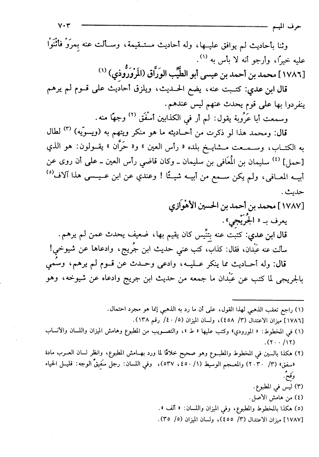 قَالَ: وَمُحَمّد هَذَا لَو ذكرت من أَحَادِيثه مَا هُوَ مُنكر ويتهم بِهِ (ويسويه) لطال بِهِ الْكتاب، وَسمعت مَشَايِخ بَلَده " رَأس الْعين " و " حران " يَقُولُونَ: هُوَ الَّذِي [حمل] سُلَيْمَان بن الْمعَافى بن سُلَيْمَان - وَكَانَ قَاضِي رَأس الْعين - على أَن روى عَن أَبِيه الْمعَافى، وَلم يكن سمع من أَبِيه شَيْئا {وَعِنْدِي عَن ابْن عِيسَى هَذَا آلَاف حَدِيث.