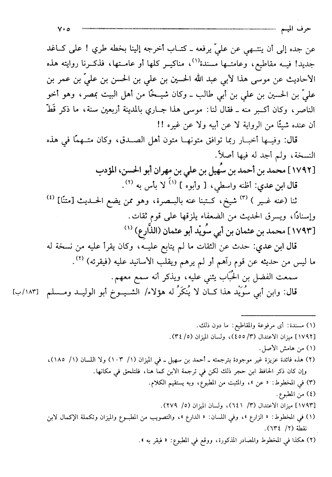 عَن جده إِلَى أَن يَنْتَهِي عَن عَليّ يرفعهُ - كتاب أخرجه إِلَيْنَا بِخَطِّهِ طري {على كاغد جَدِيد} فِيهِ مقاطيع، وعامتها مُسندَة، مَنَاكِير كلهَا أَو عامتها، فَذَكرنَا رِوَايَته هَذِه الْأَحَادِيث عَن مُوسَى هَذَا لأبي عبد الله الْحُسَيْن بن عَليّ بن الْحسن بن عَليّ بن عمر بن عَليّ بن الْحُسَيْن بن عَليّ بن أبي طَالب - وَكَانَ شَيخا من أهل الْبَيْت بِمصْر، وَهُوَ أَخُو النَّاصِر، وَكَانَ أكبر مِنْهُ - فَقَالَ لنا: مُوسَى هَذَا جاري بِالْمَدِينَةِ أَرْبَعِينَ سنة، مَا ذكر قطّ أَن عِنْده شَيْئا من الرِّوَايَة لَا عَن أَبِيه وَلَا عَن غَيره {}