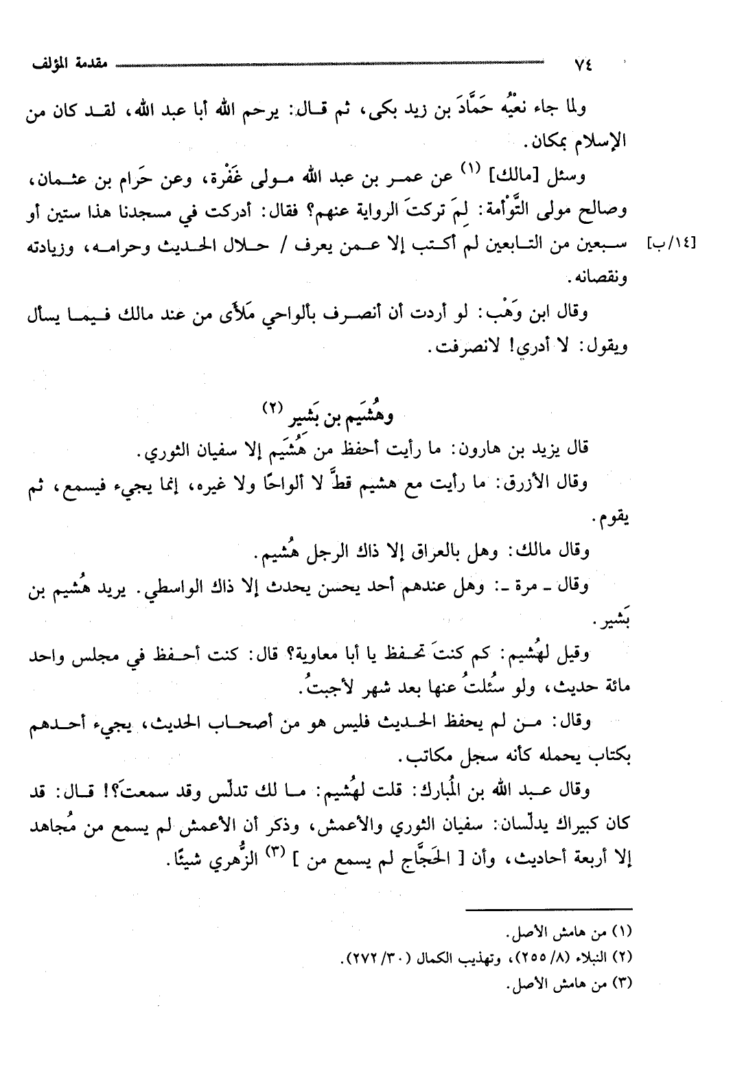 وَسُئِلَ [مَالك] عَن عمر بن عبد الله مولى غفرة، وَعَن حرَام بن عُثْمَان، وَصَالح مولى التَّوْأَمَة: لم تركت الرِّوَايَة عَنْهُم؟ فَقَالَ: أدْركْت فِي مَسْجِدنَا هَذَا سِتِّينَ أَو سبعين من التَّابِعين لم أكتب إِلَّا عَمَّن يعرف، حَلَال الحَدِيث وَحَرَامه، وزيادته ونقصانه.
