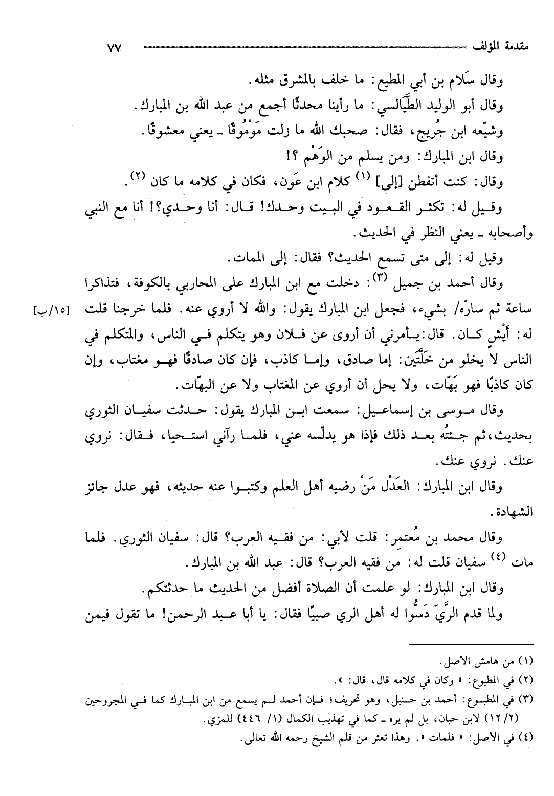 وَقَالَ مُحَمَّد بن مُعْتَمر: قلت لأبي: من فَقِيه الْعَرَب؟ قَالَ: سُفْيَان الثَّوْريّ. فَلَمَّا مَاتَ سُفْيَان قلت لَهُ: من فَقِيه الْعَرَب؟ قَالَ عبد الله بن الْمُبَارك.